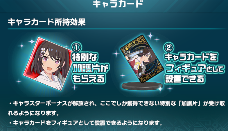キャラクターを入手すると購入できるようになるキャラカード。カードを所持している状態で該当のキャラをパーティに編成してバトルをしたり、キャラを重複して獲得すると入手できるキャラスターがカウントアップされ、ここでしか獲得できない特別な「加護片」が受け取れるようになります。