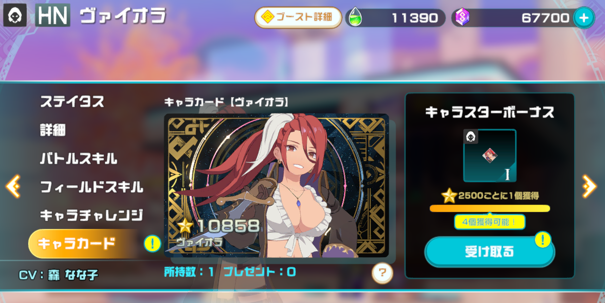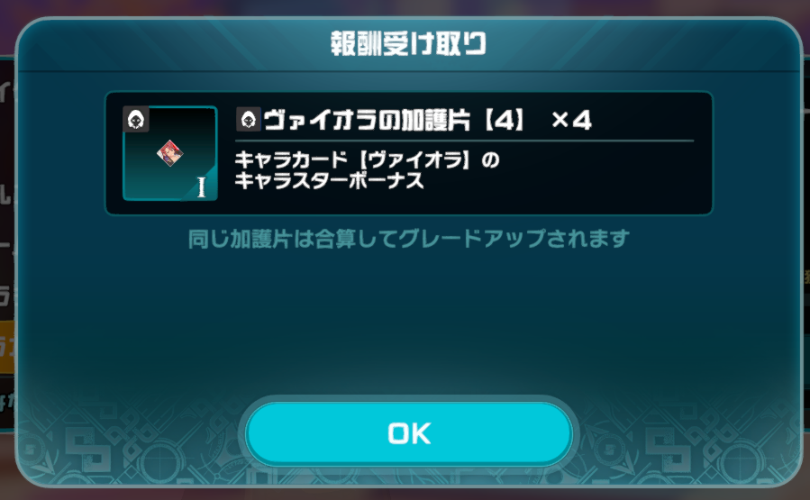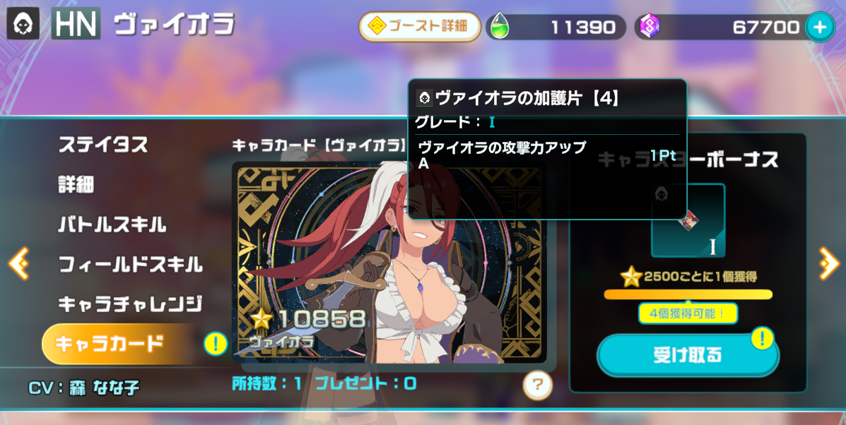 ヴァイオラのキャラスターは10858溜まっていたのでキャラスターボーナスで加護片を4つ入手できました。