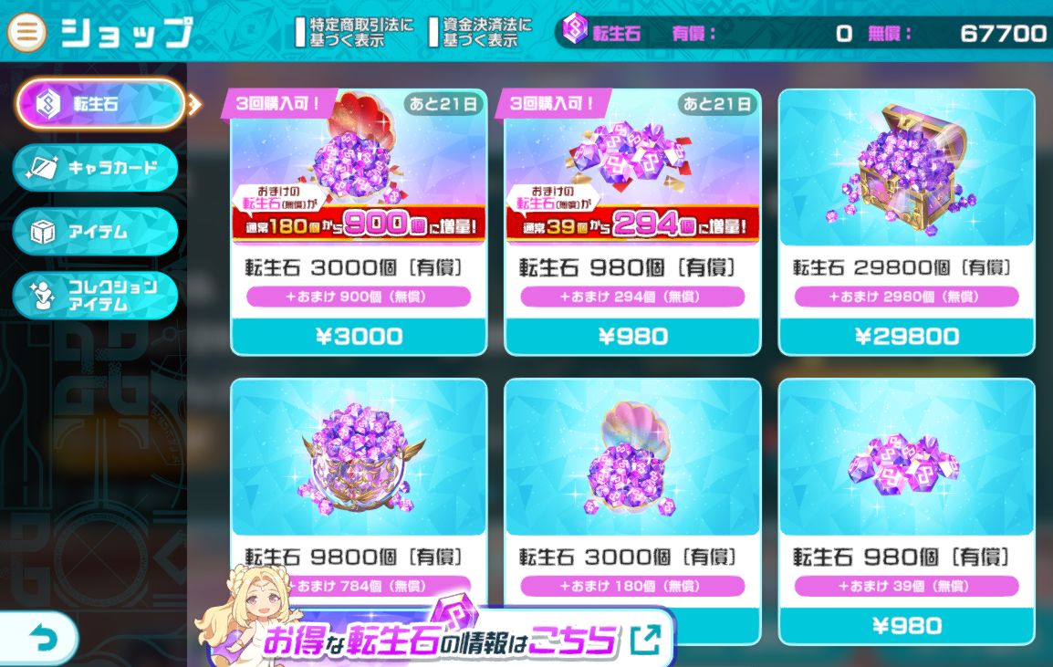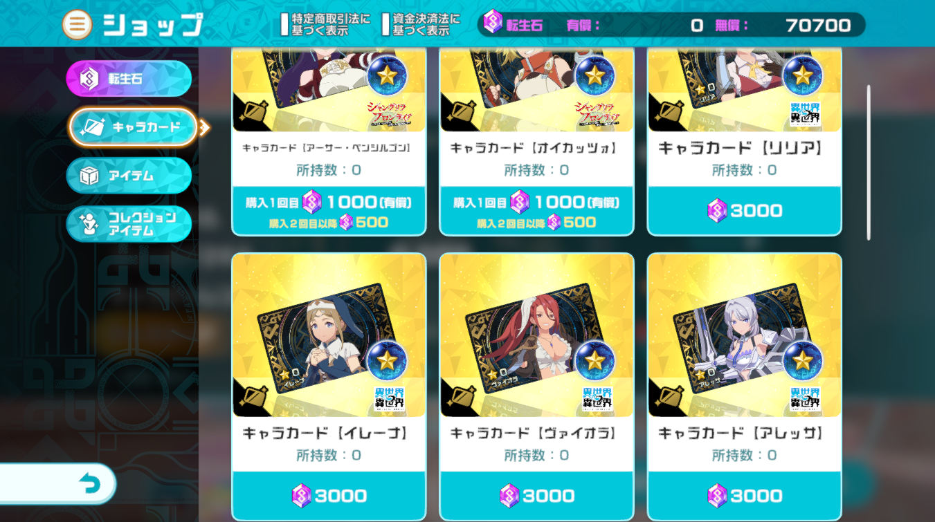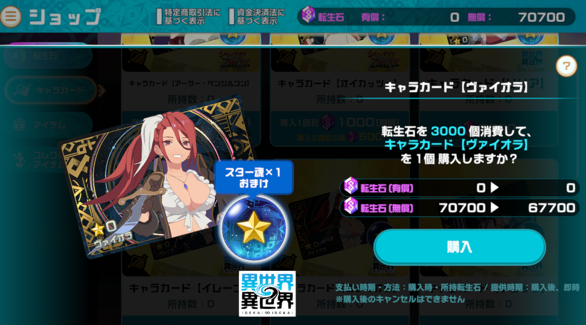 キャラカードは転生石(有償)で購入できるものと転生石(無償)で購入できるものがあります。