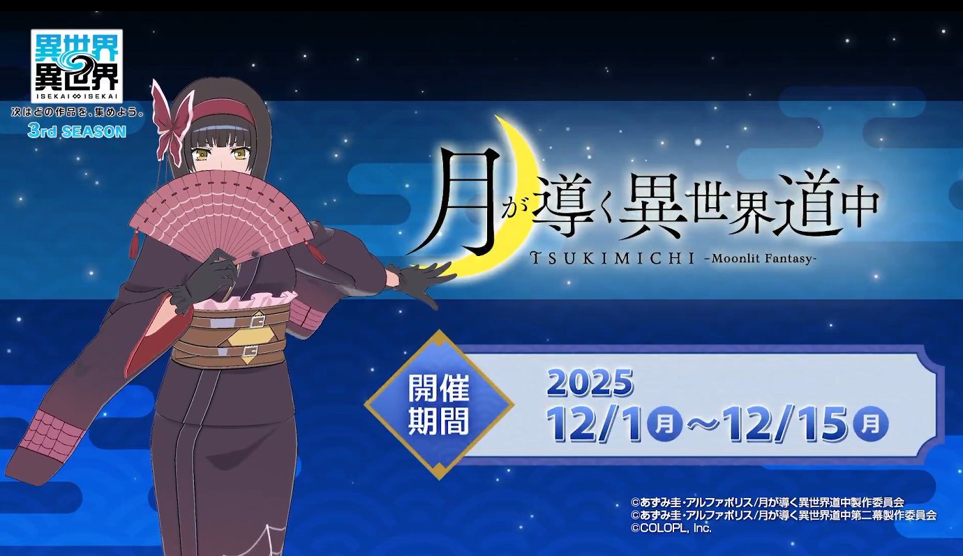12月1日から開始予定の異世界∞異世界の月が導く異世界道中イベントの最新情報です。ツキミチ実装キャラクターの真、巴、澪のスキルが公開されています。