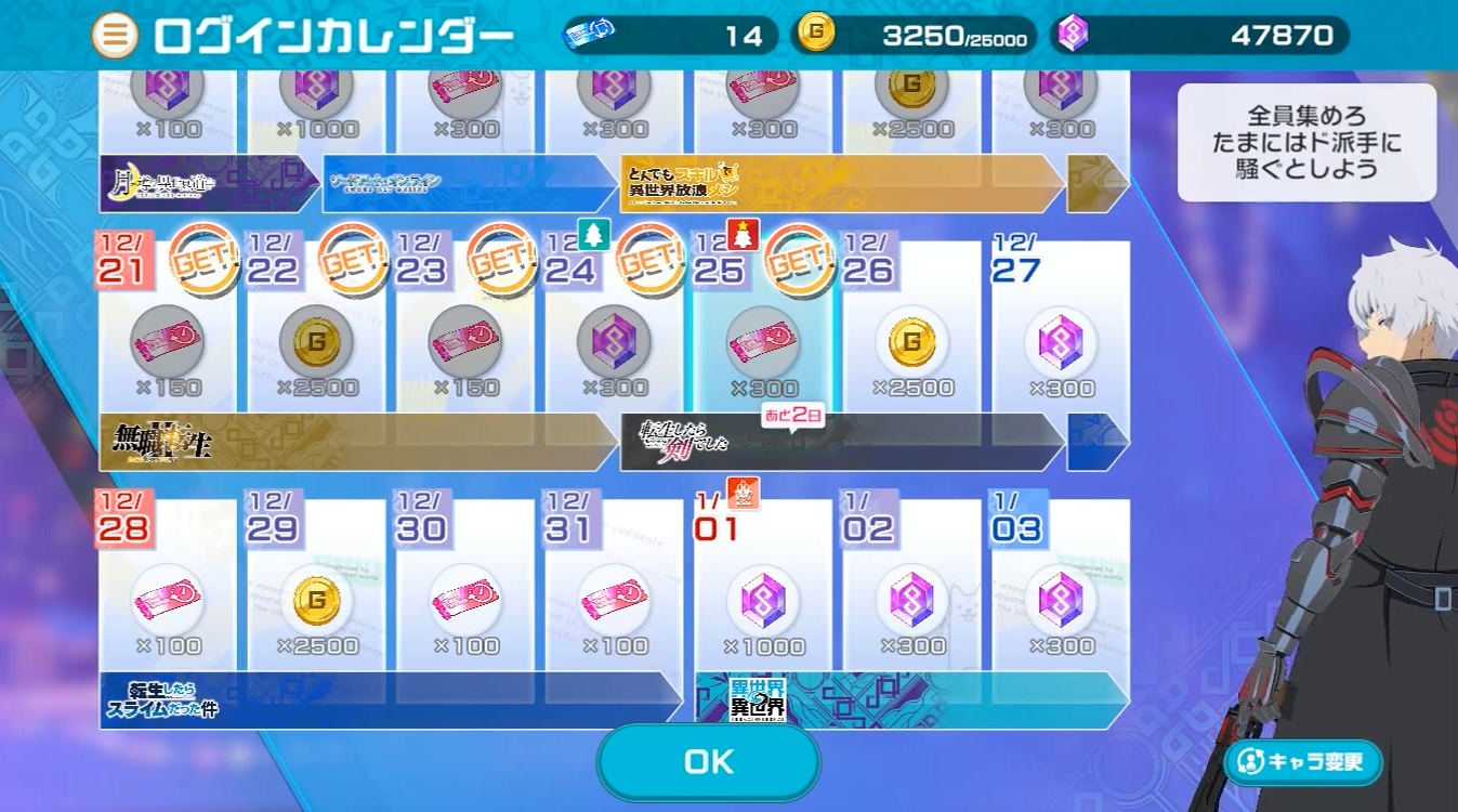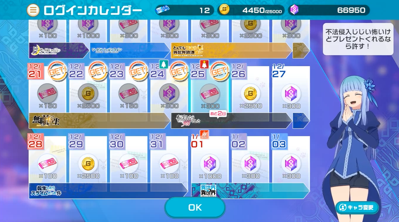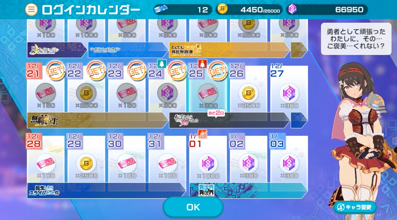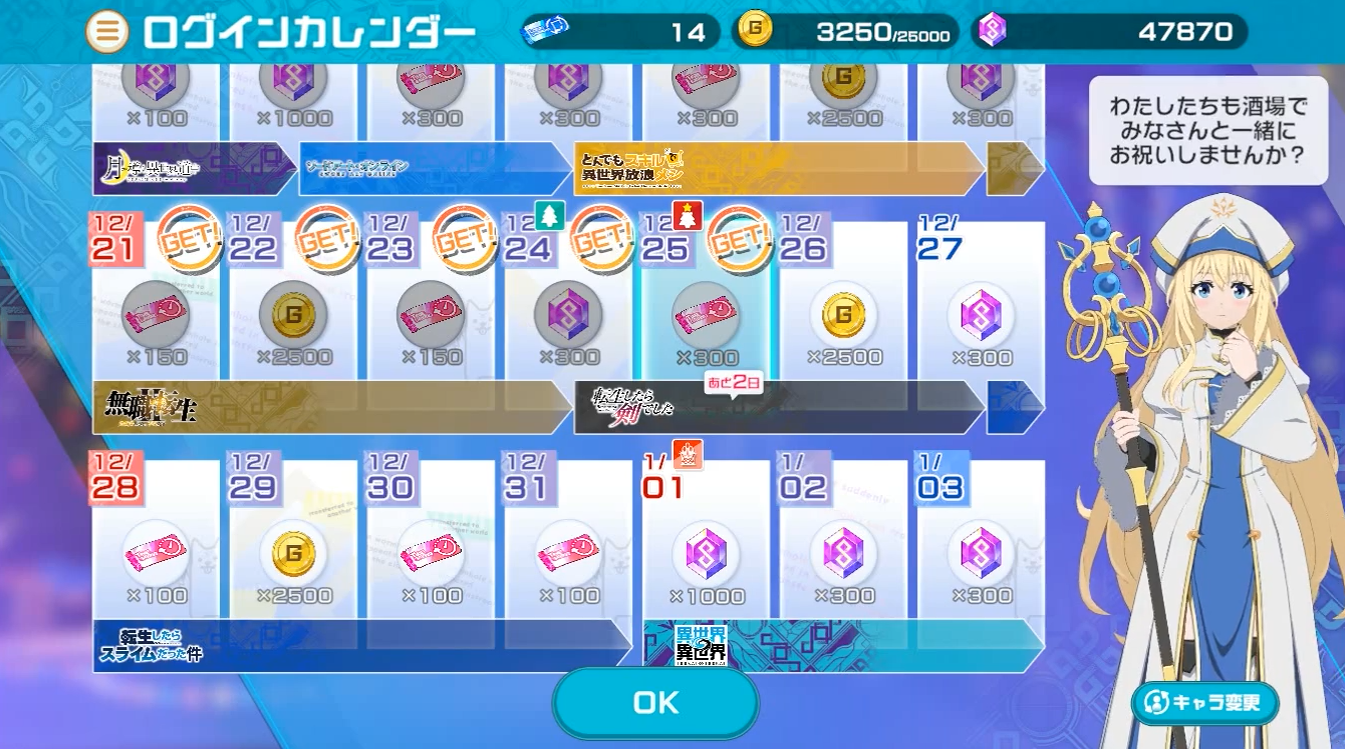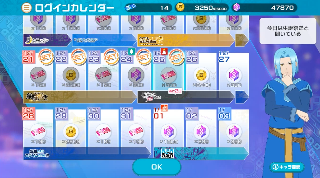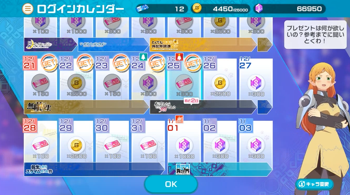 異世界異世界(いせいせ)のログインカレンダーでクリスマス専用のボイスがある手持ちキャラをまとめました。全てのキャラにあるわけではなく、例えば転スラや第七王子などはありません。以下の画像を掲載しているキャラは上記の動画でボイスをチェックする事ができます。