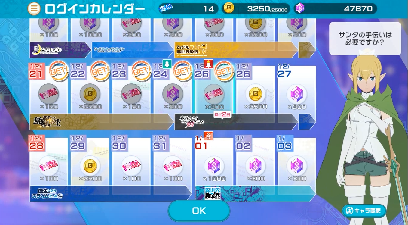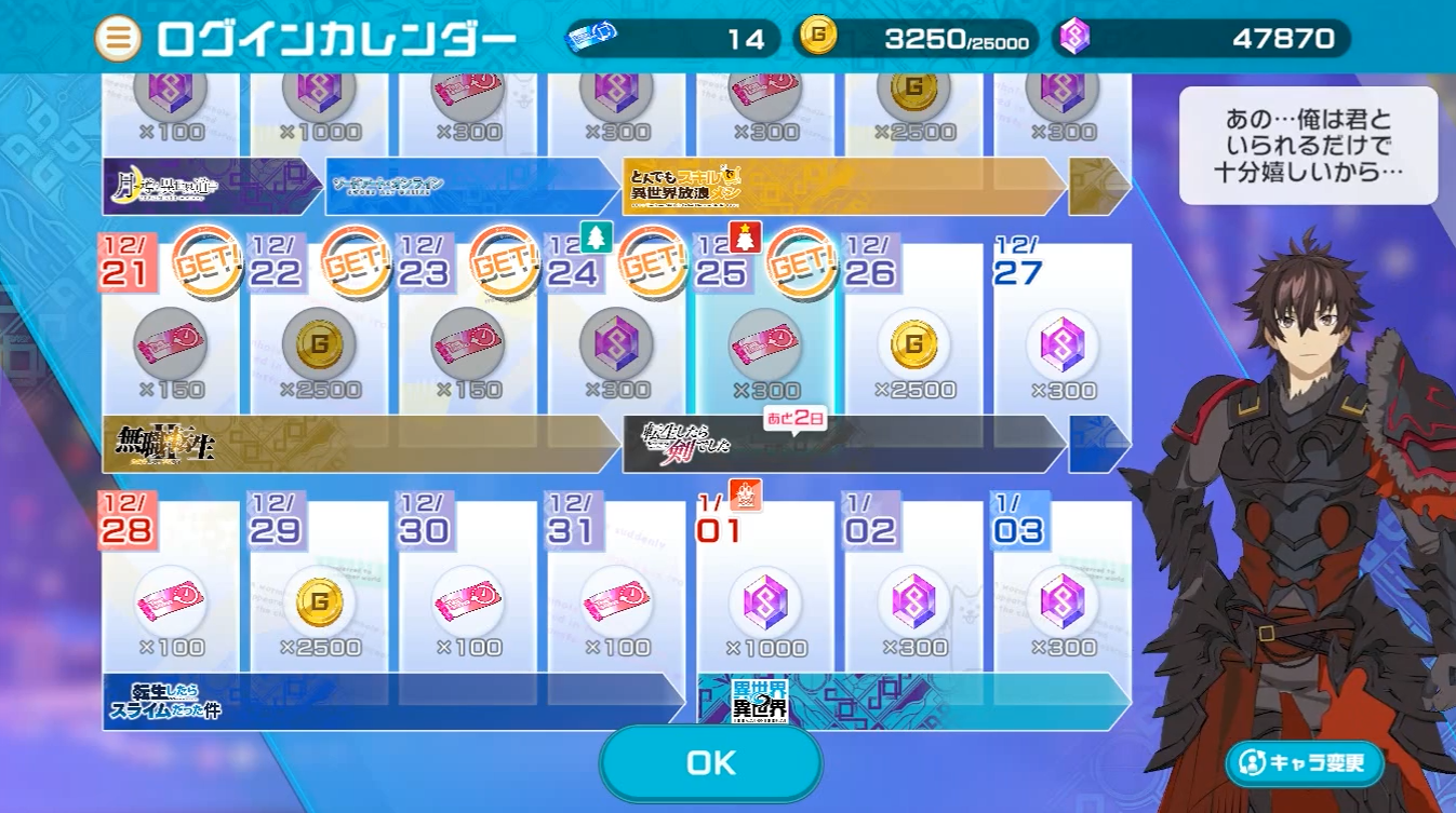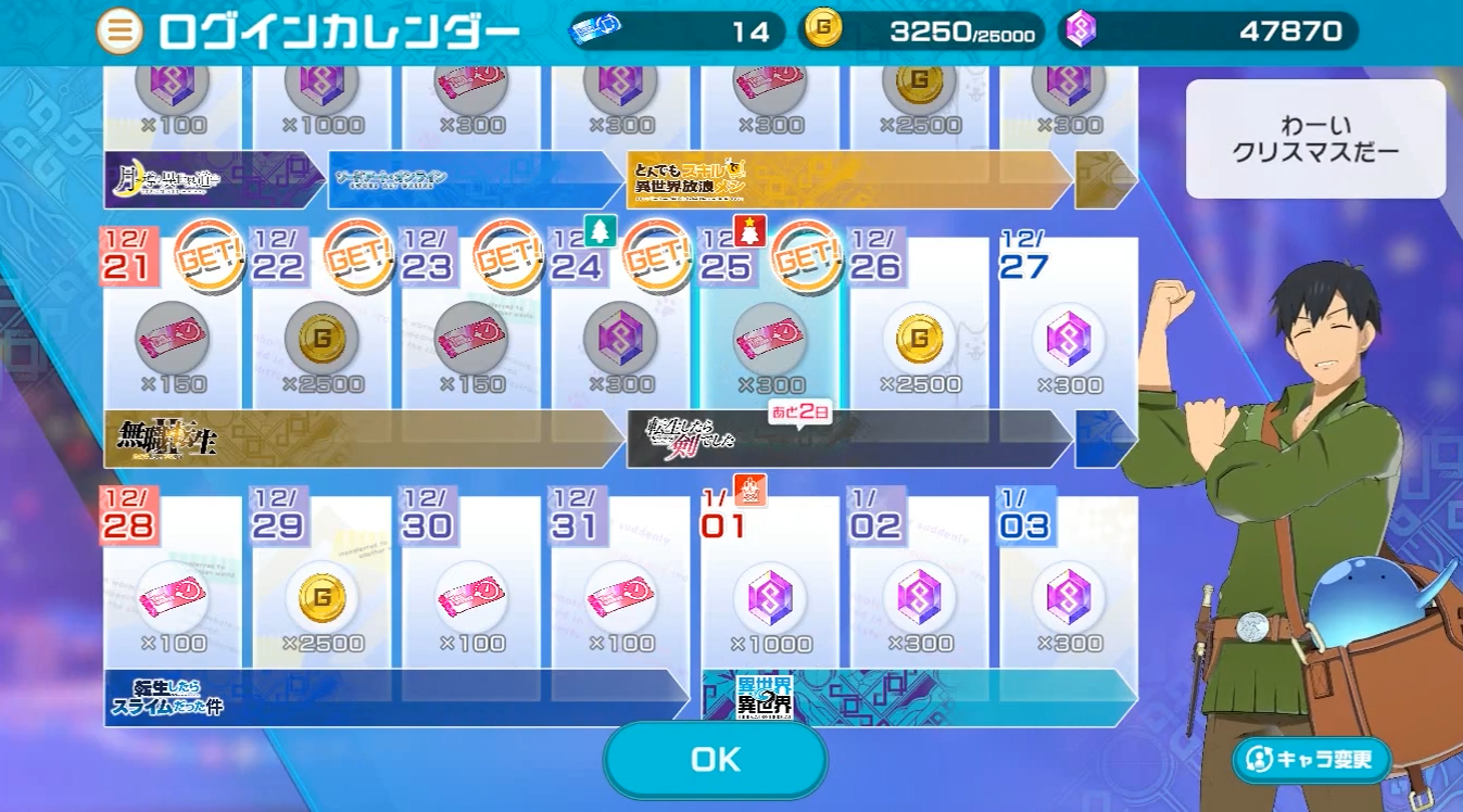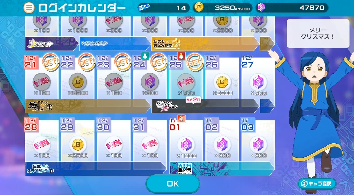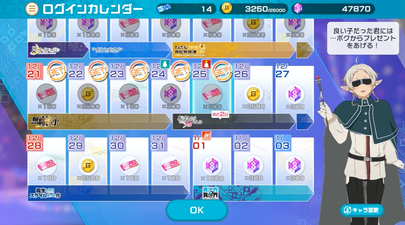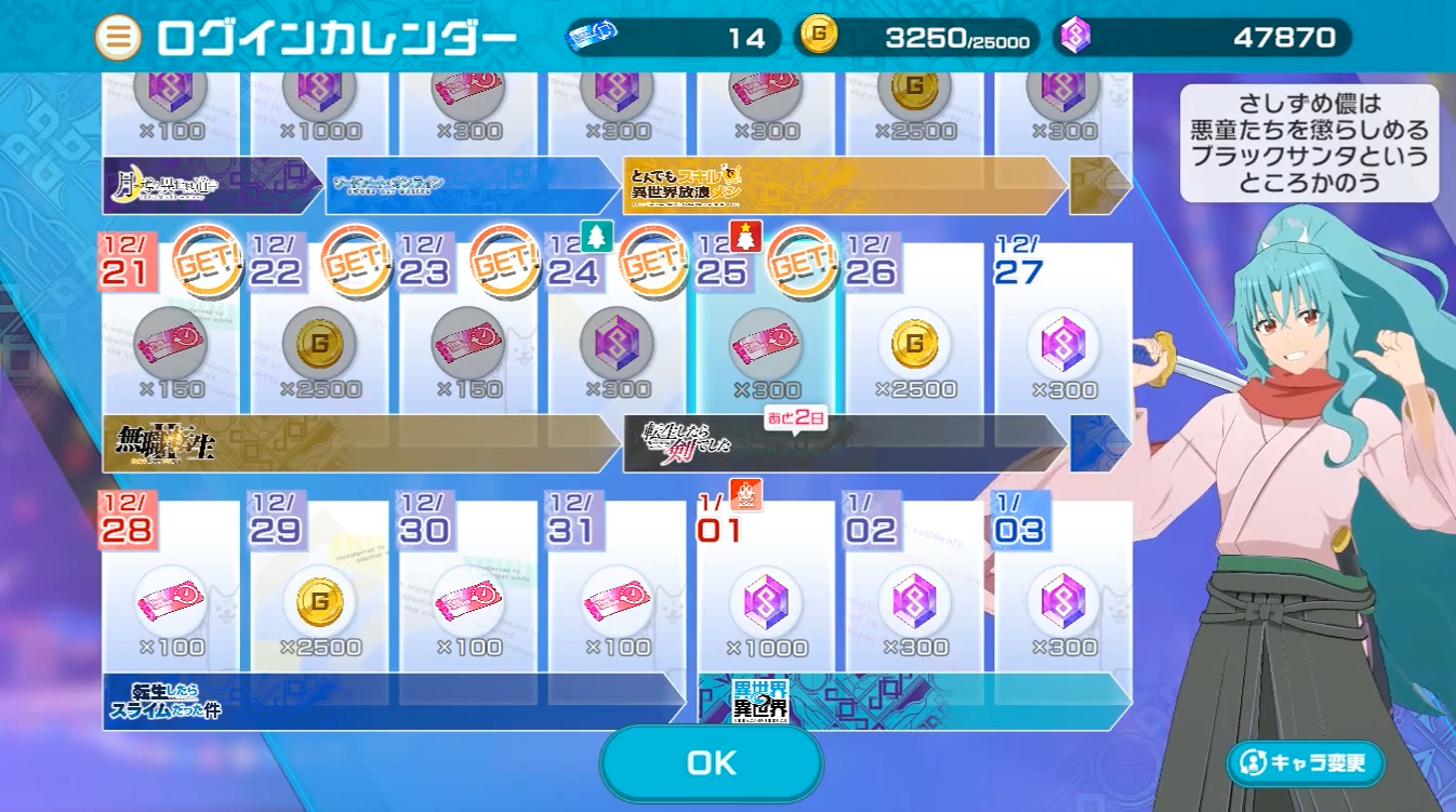 異世界異世界(いせいせ)のログインカレンダーでクリスマス専用のボイスがある手持ちキャラをまとめました。全てのキャラにあるわけではなく、例えば転スラや第七王子などはありません。以下の画像を掲載しているキャラは上記の動画でボイスをチェックする事ができます。