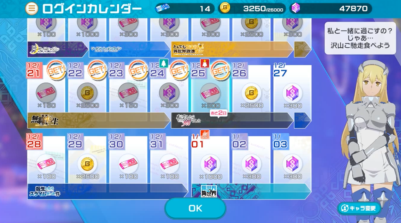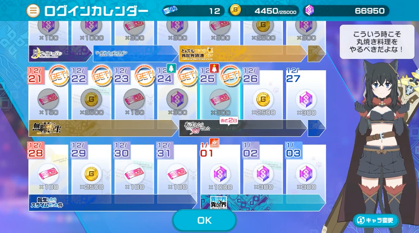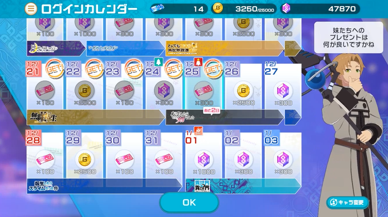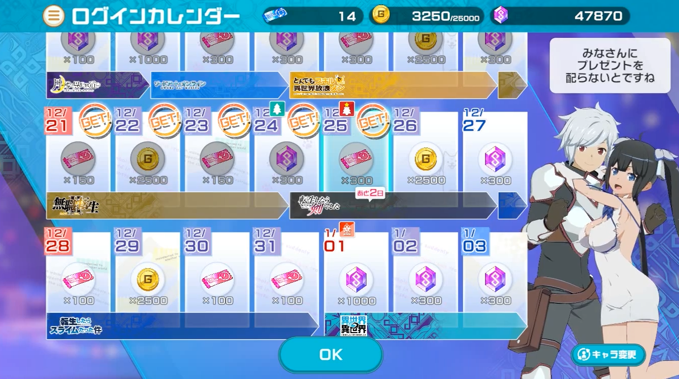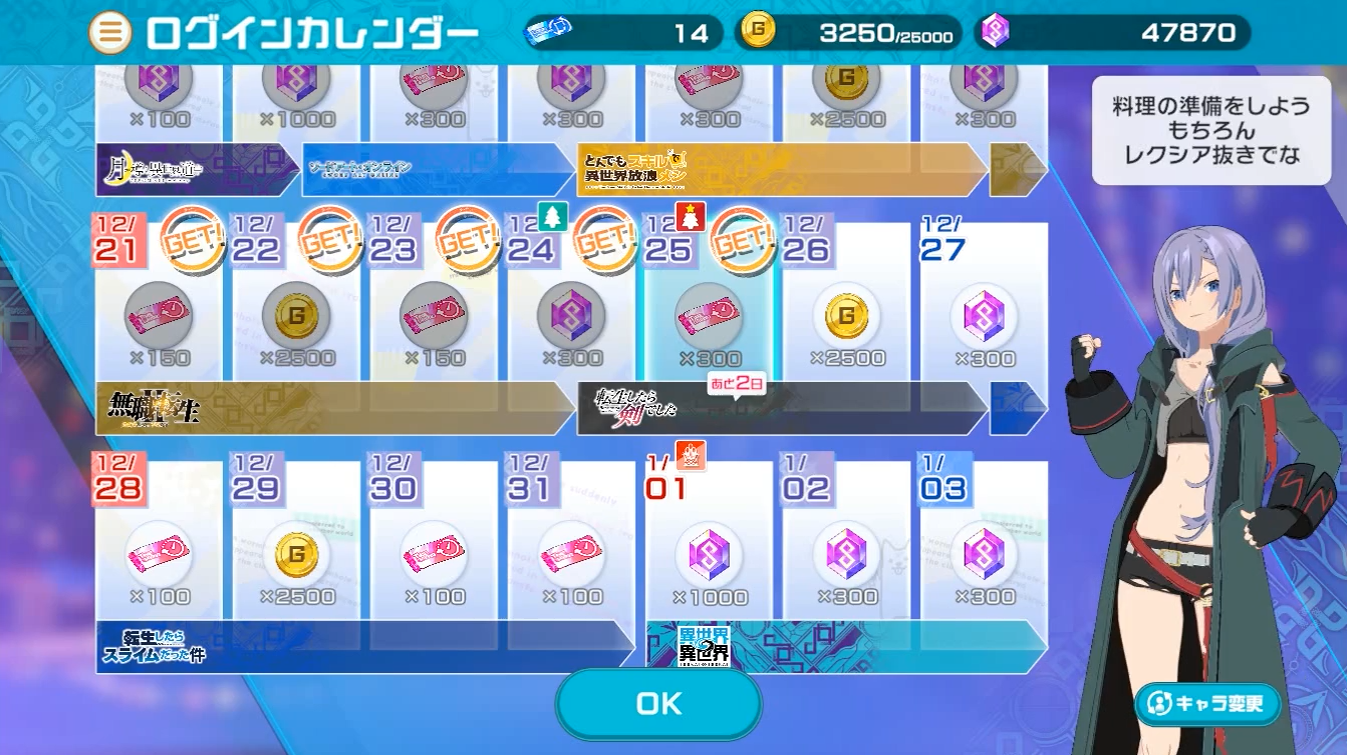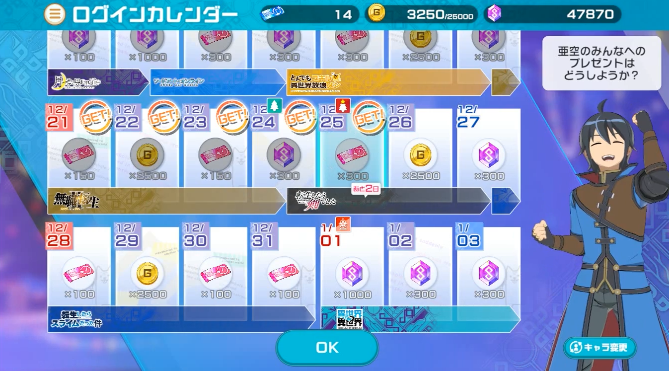 異世界異世界(いせいせ)のログインカレンダーでクリスマス専用のボイスがある手持ちキャラをまとめました。全てのキャラにあるわけではなく、例えば転スラや第七王子などはありません。以下の画像を掲載しているキャラは上記の動画でボイスをチェックする事ができます。