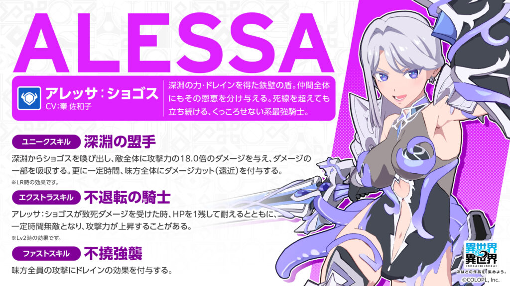 異世界∞異世界(いせいせ)の1月1日に実装されるいせいせオリジナルキャラクター「アレッサ:ショゴス」 … 続きを読む いせいせアレッサやばい!味方全員にドレイン付与!異世界異世界