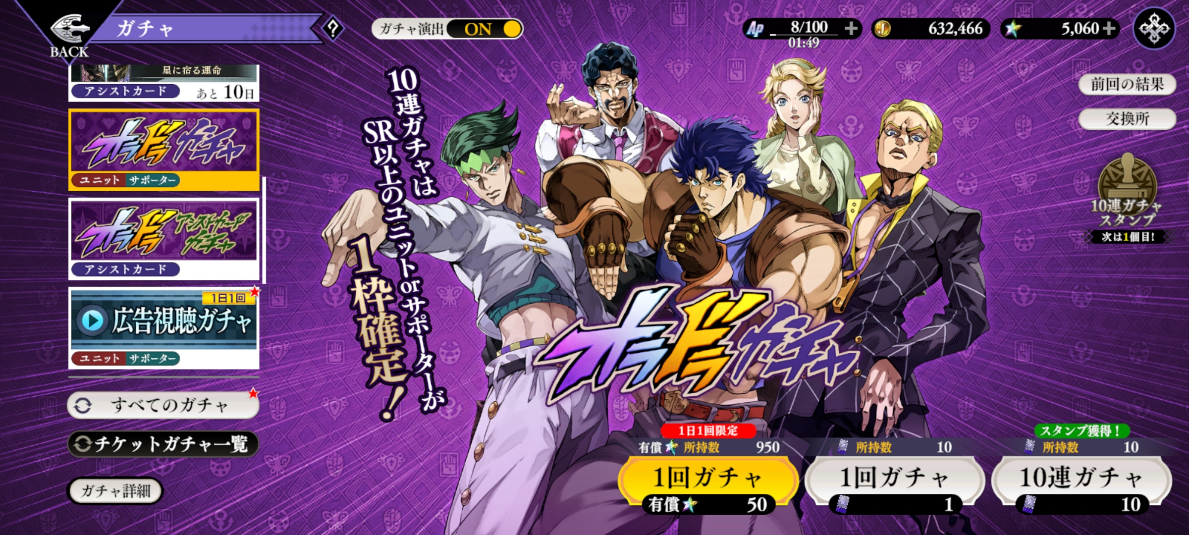 ジョジョの奇妙な冒険オラオラオーバードライブの恒常ガチャとなるオラドラガチャがガチャチケットが用意されていますが、単発で引いてはいけません。