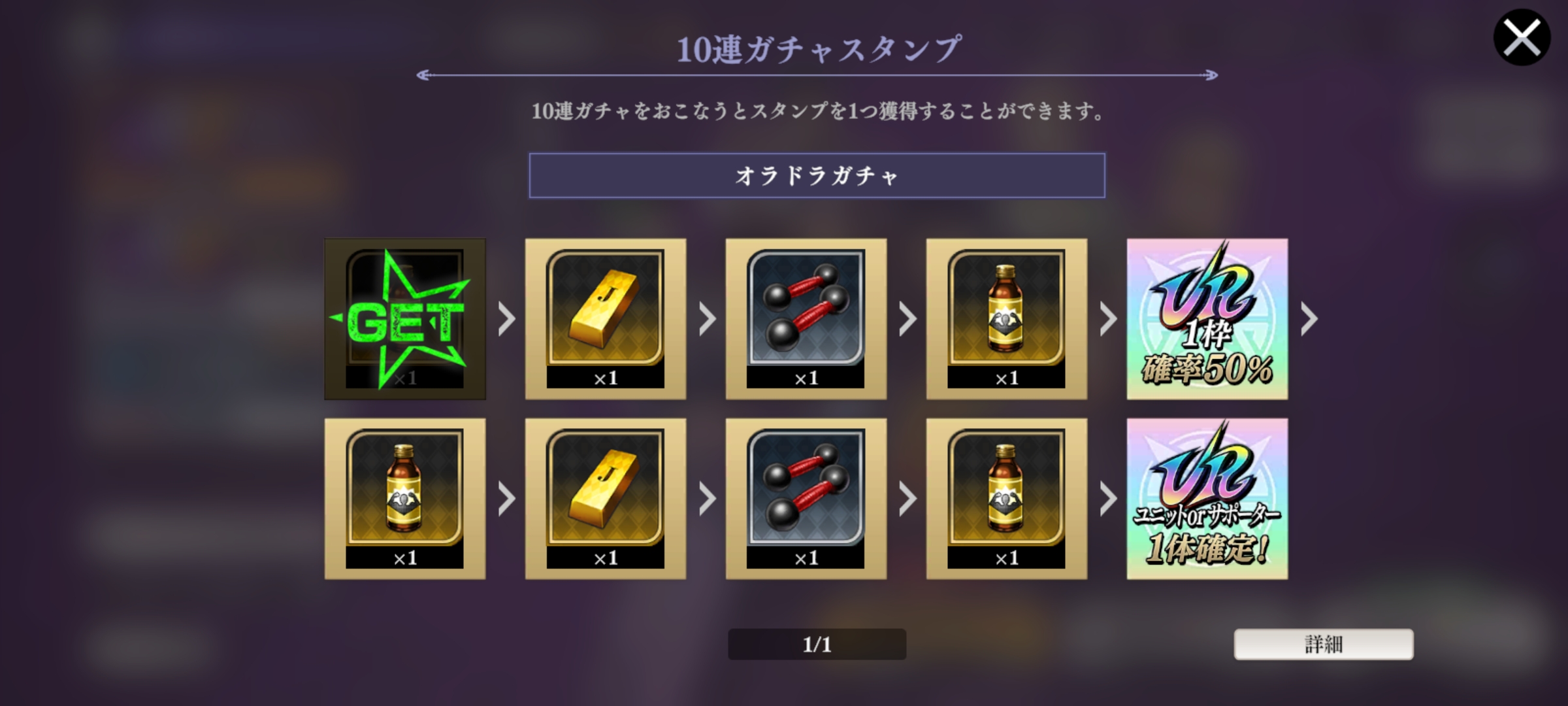 ピックアップガチャ同様に10連でのスタンプが用意されているので必ずチケットを10枚以上ためて10連ガチャするようにしましょう。
