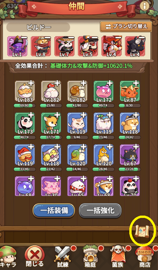 キノコ伝説マップ探索1日目は仲間ページ右下【ダンジョン飯コラボ】
