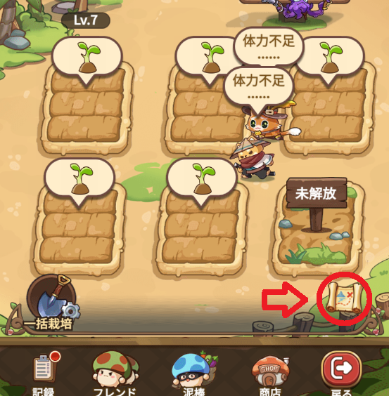 マップは「箱庭」→「キノコ農場」ページの右上にあるのでタップしましょう。
