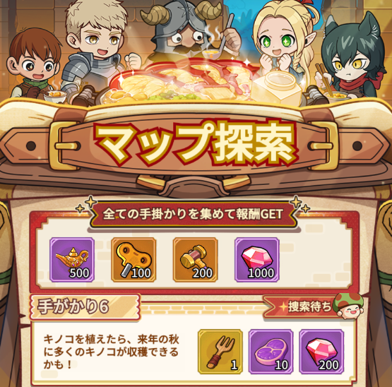 キノコ伝説:勇者と魔法のランプ(キノデン)は10月1日から「ダンジョン飯」とのコラボイベント「キノコ島飯」開催!!イベント内コンテンツ「マップ探索」では手がかりを元にゲーム内に隠れている「マップ」をさがしていきます。
