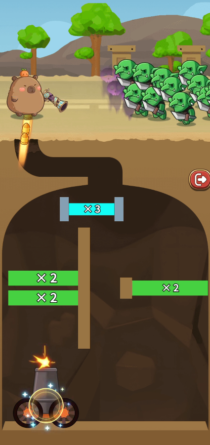 元の戦力に上下にある選択肢を足したり掛けたりして、戦力を増やし敵を倒していくミニゲーム。上の画像だと戦力+60の方が高いので上ルートへ進みます。