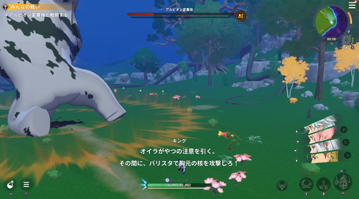 変異体アルビオンのHP30%くらいでキングが「オイラがやつの注意を引く。その間に、バリスタで胸元の核を攻撃しろ!」と発言します。おい、バリスタってなんだよ、説明しろ!