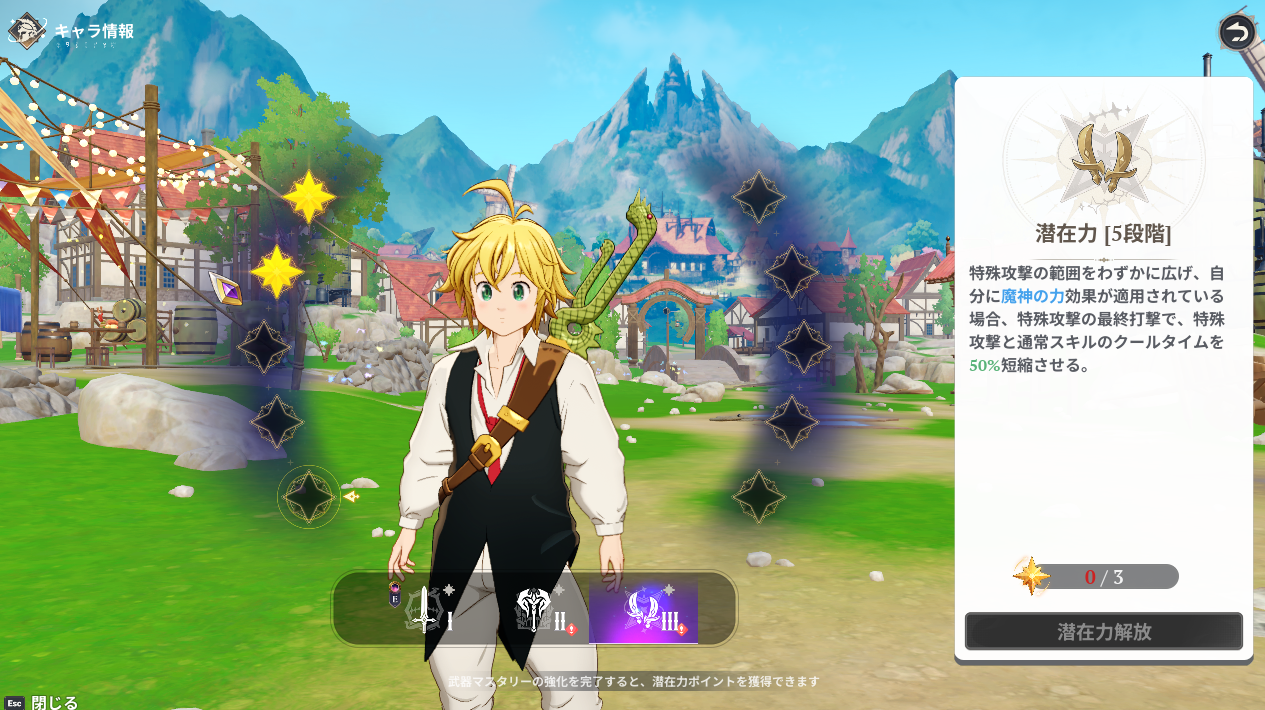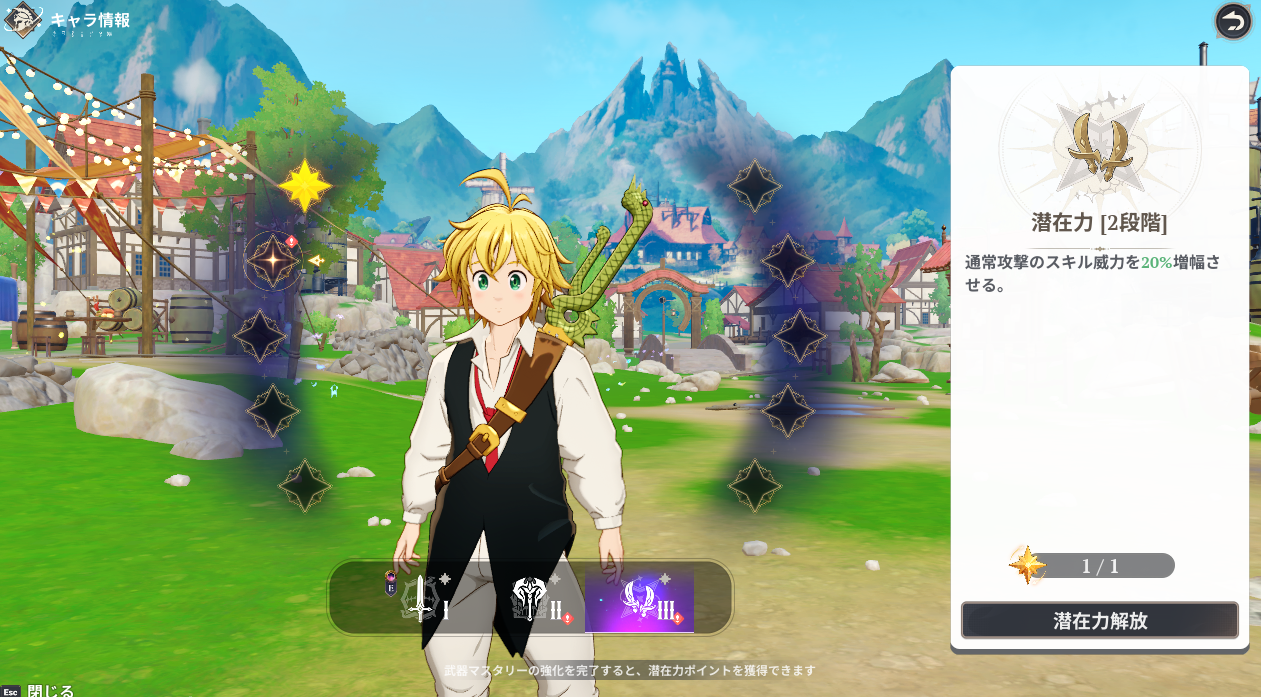 既にメリオダスを所持している場合はキャラメニューの潜在力から凸する必要があります。