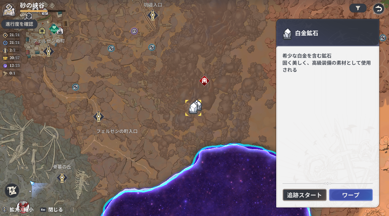 砂の峡谷は坑道入口から崖・山沿いに進むとわかりやすい。