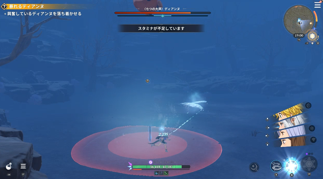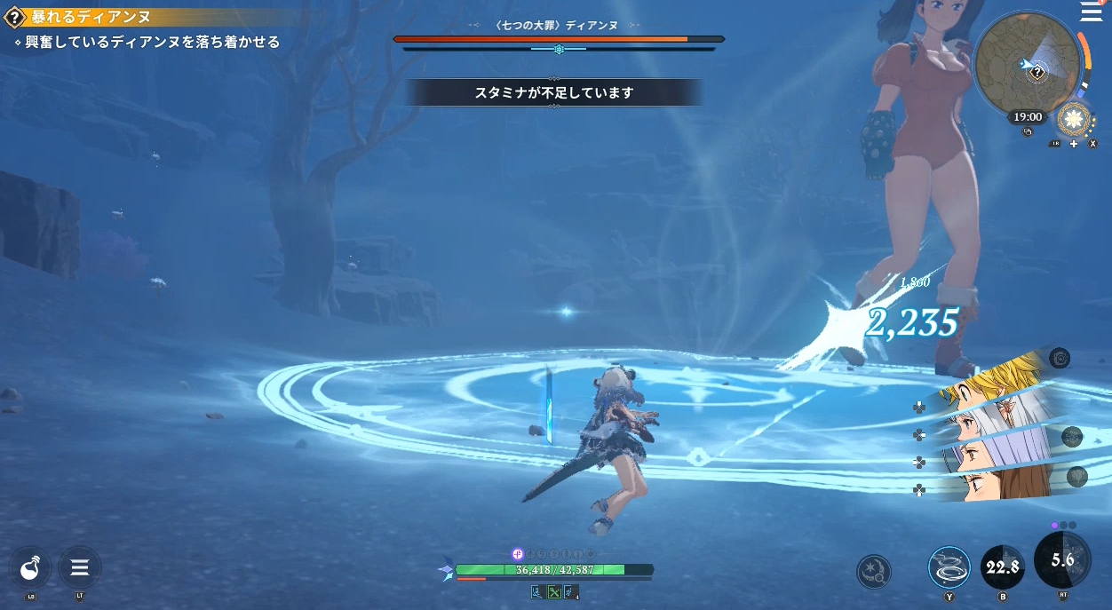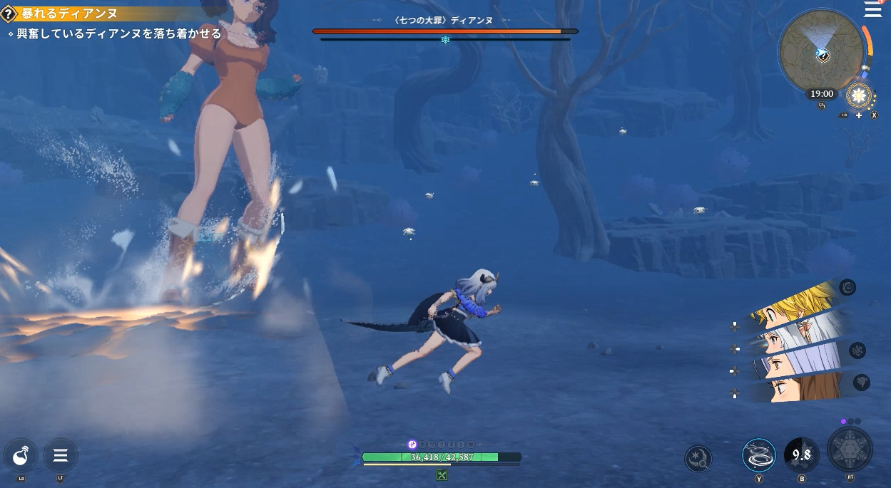 七つの大罪Origin(ナナオリ)暴れるディアンヌ「興奮しているディアンヌを落ち着かせる」で戦うディアンヌは攻撃間隔が早く、範囲も広いのでしっかり避けて、少しの攻撃がオススメです。欲張って攻撃しすぎると巻き込まれる。