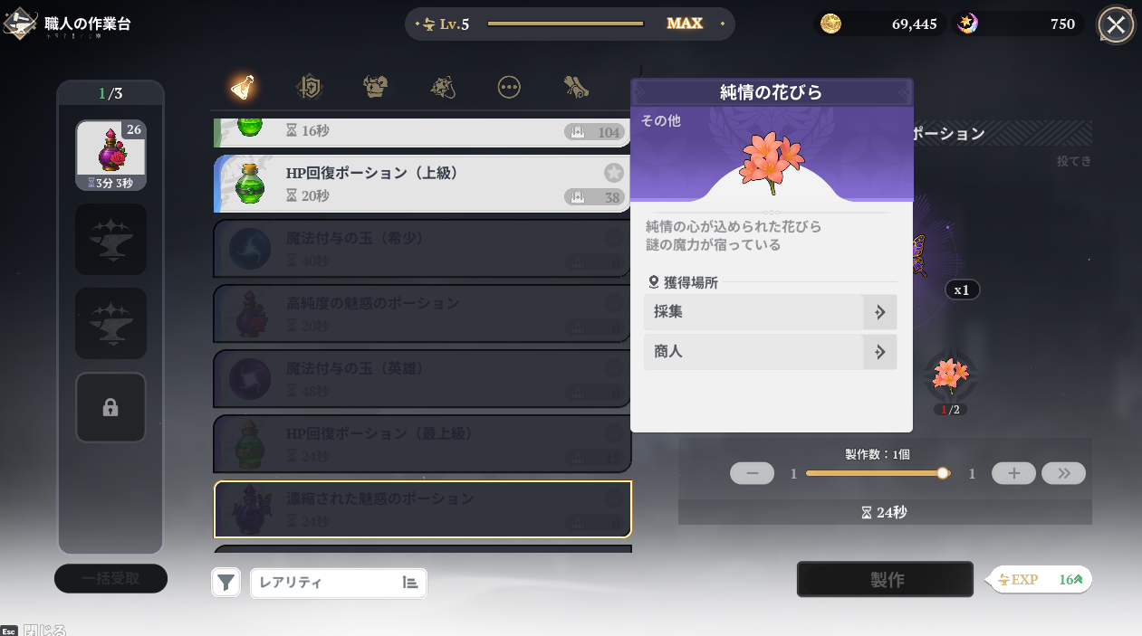 純情の花びらもフィールド採集で入手できます。が、少しずつしか入手できないのでアイテムサーチを何度も繰り返して確保する必要がありそうです。めんどくさ。