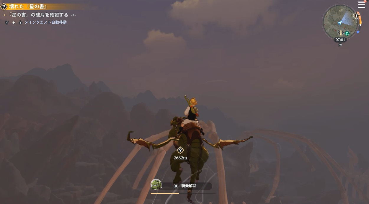 うおおおおおおおお!飛んだぁ!メリオダスでも登れない崖はかなりあるので、これでフィールド探索が楽になりそうです。スタミナなしでずっと飛びたいなぁ。