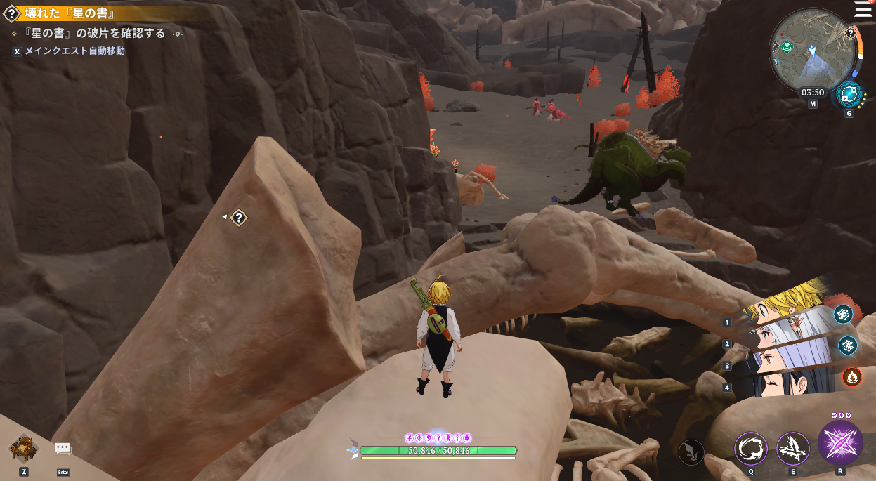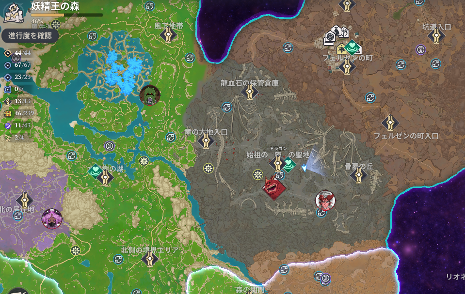 始祖の龍の聖地から少し東。崖の間に骨があるので特徴的な場所です。