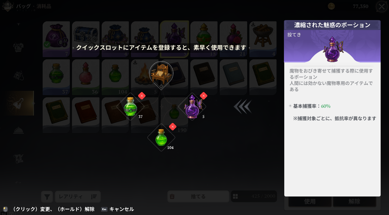 濃縮された魅惑のポーションをクイックスロットにセット。基本捕獲率は60%で、緑のワイルドドラゴンの捕獲抵抗率が49%になっています。