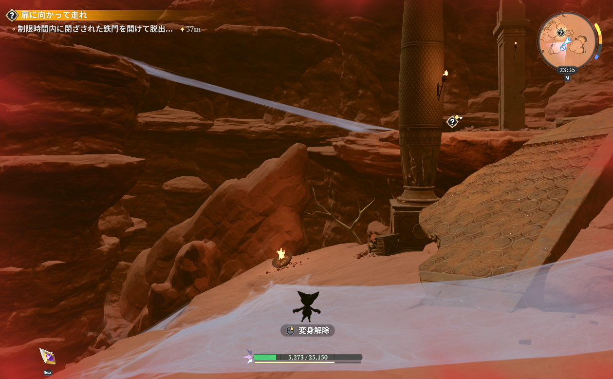 飛行中はHPゲージの下にあるスタミナゲージが減り続けスタミナゲージがなくなると元の姿に戻り飛行できなくなるので、スタミナゲージがなくなる前に次の足場を確保しておきましょう。