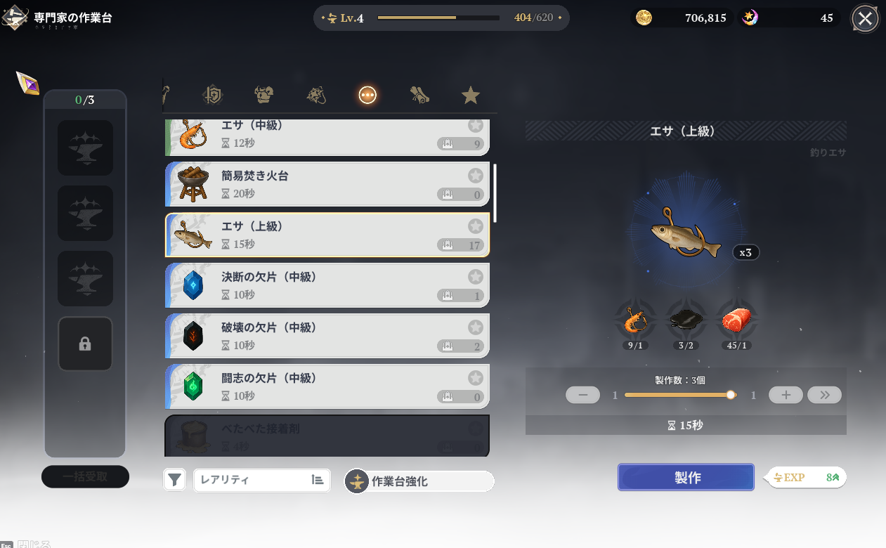 餌は上級のエサを好むようなので、製作で作っておきましょう。