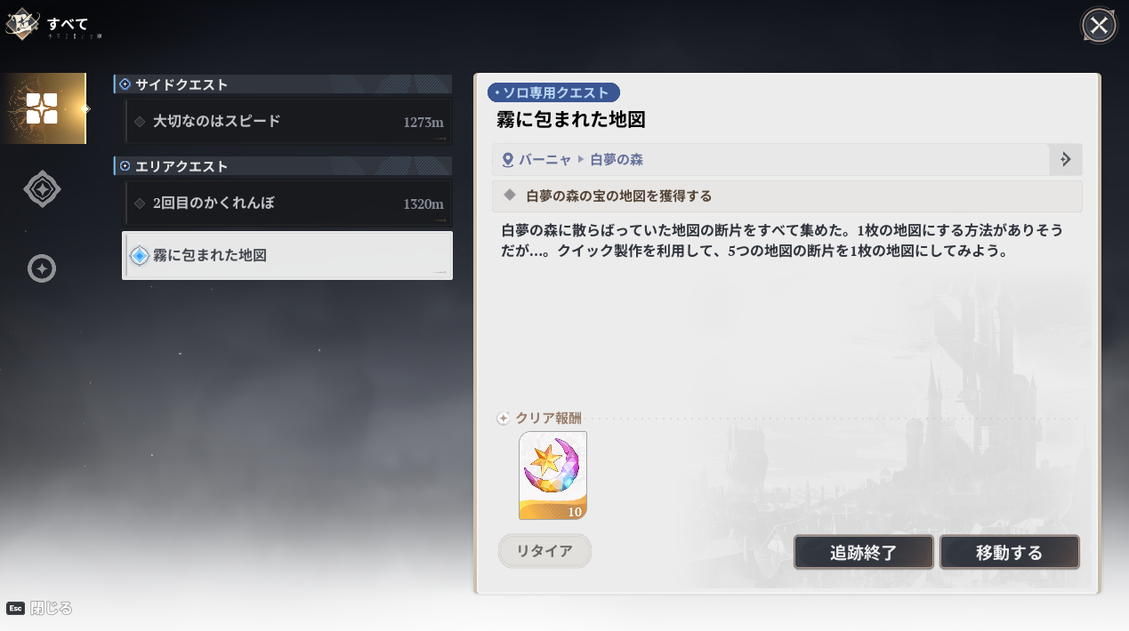 七つの大罪(ナナオリ)のエリアクエスト「霧に包まれた地図」では5つの地図の断片をクイック制作を利用して合体する必要があります。クイック制作って?