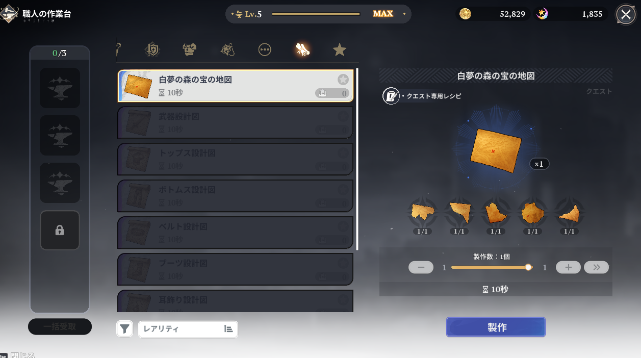 答えは作業台でした。あー、クイック制作ではなくクイック操作に見えていた。5つの地図の断片を使用する事で「白夢の森の宝の地図」が入手できます。