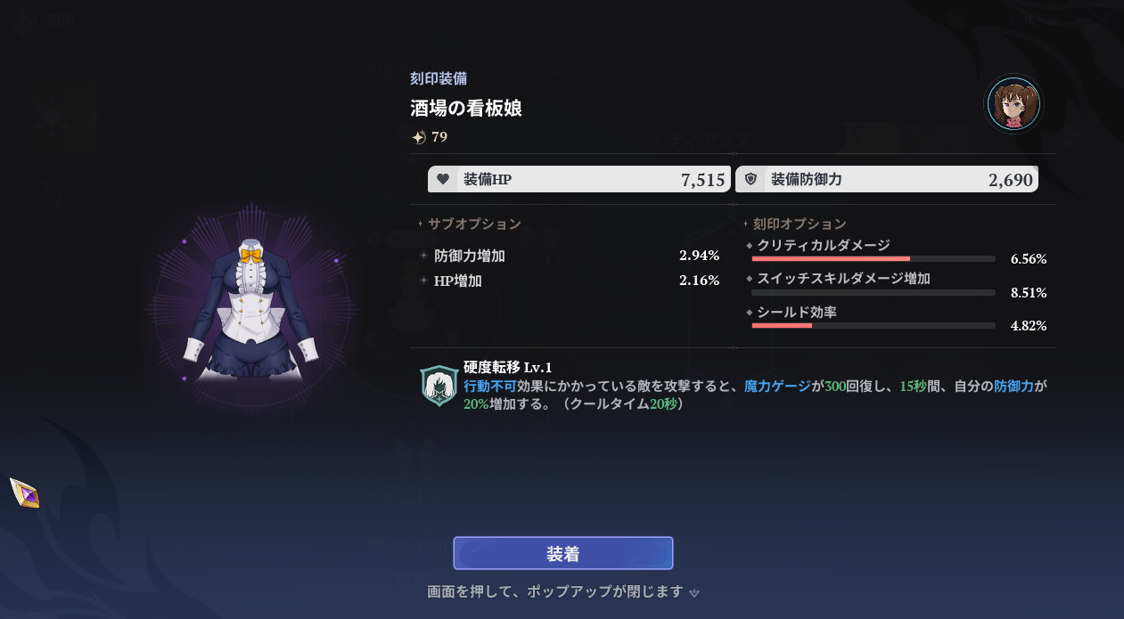 - ディアンヌ刻印装備1「酒場の看板娘」を作成!シールド効率UP!