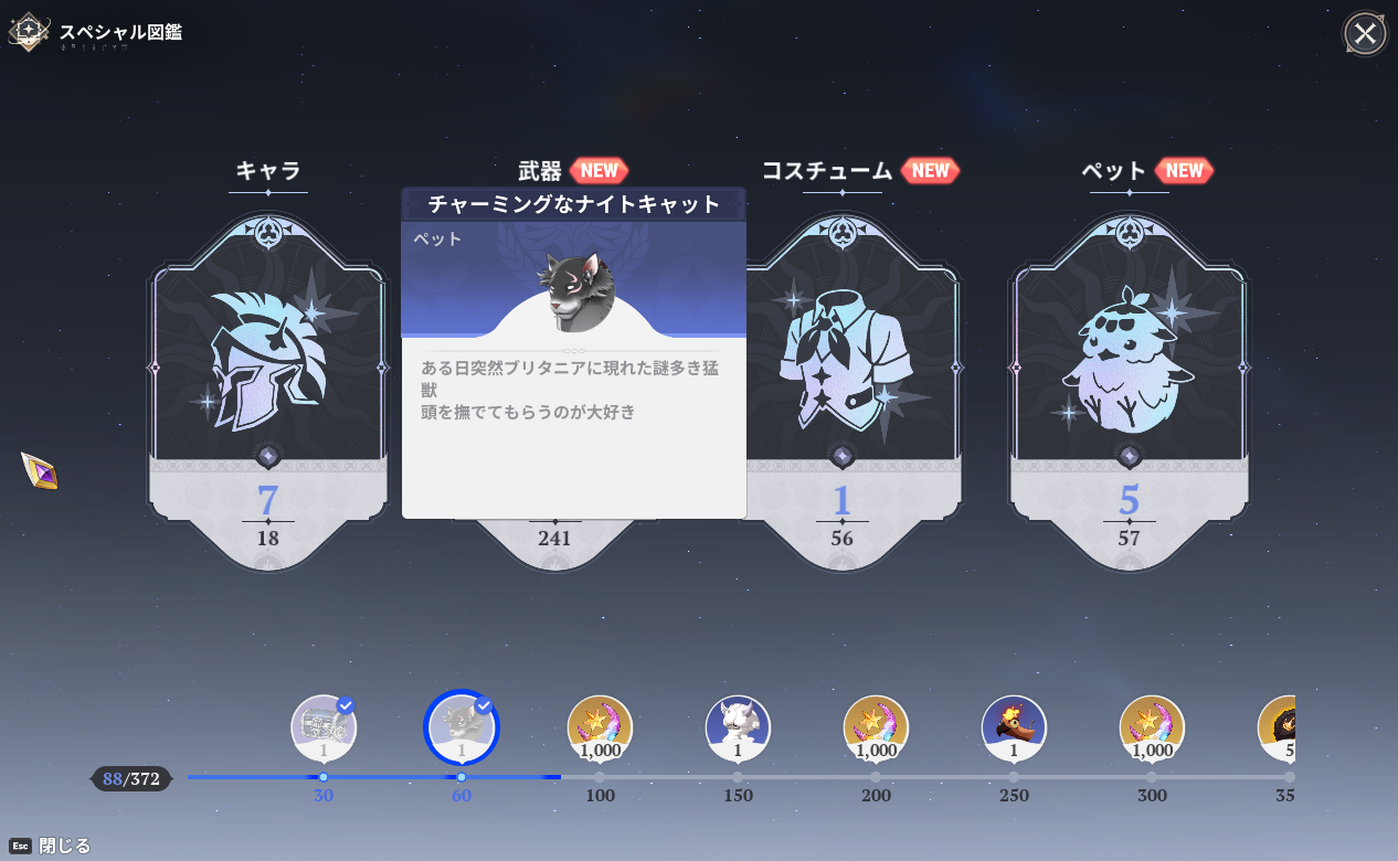 スペシャル図鑑はキャラクターの入手、武器防具コスチュームの入手、ペットの入手のカテゴリに分かれていて4つのカテゴリの総数の図鑑埋めで達成するごとに報酬を受け取れます。