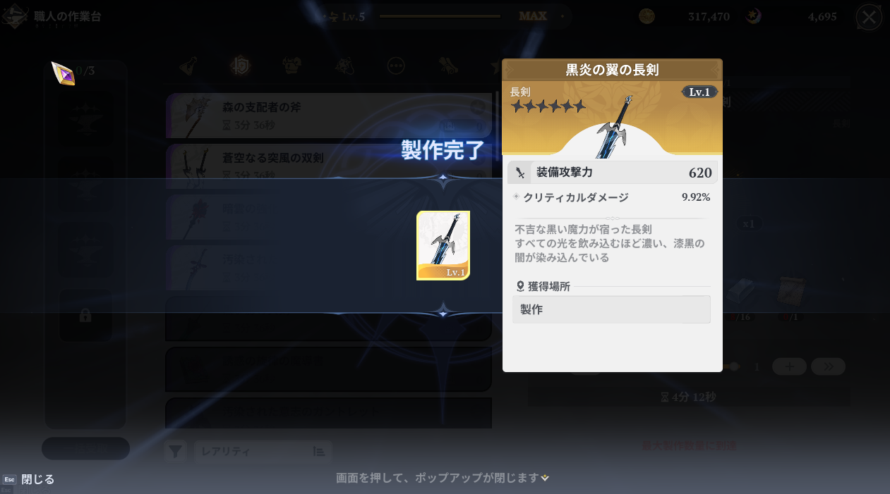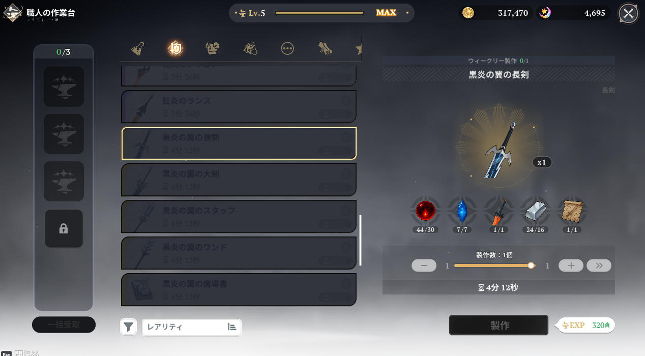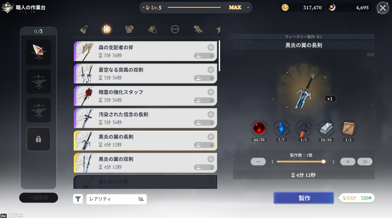 無事SSR長剣「黒炎の翼の長剣」が完成。とりあえずメリオダスを双剣から長剣へ移行して、やっぱり双剣が良い場合はマーニにあげよう。