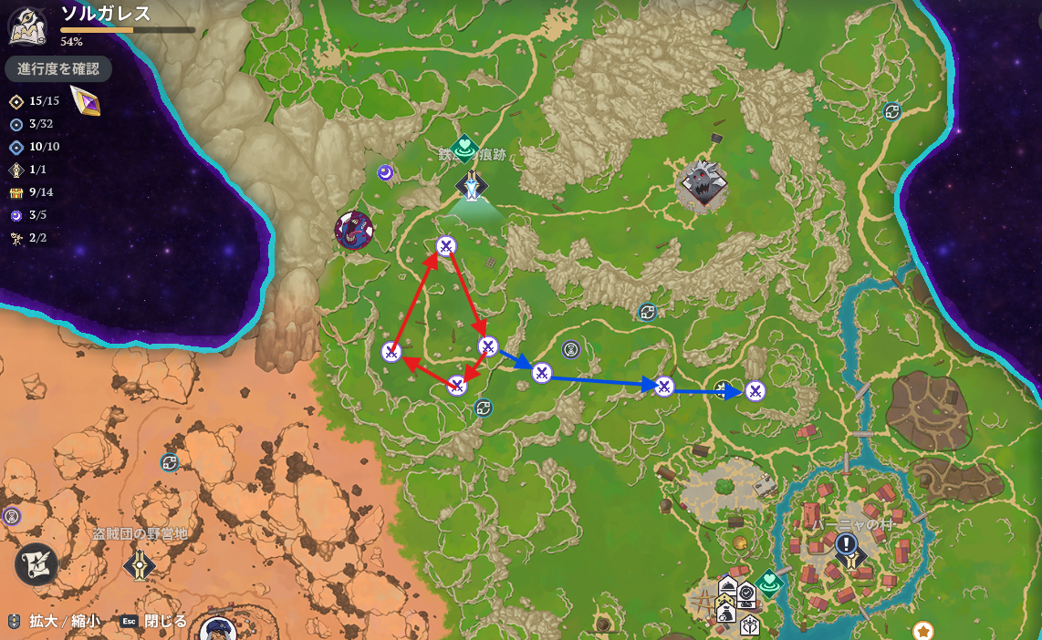 グルグル狩りたい人は赤矢印。様々なモンスターを狩る場合は赤矢印から青矢印。
