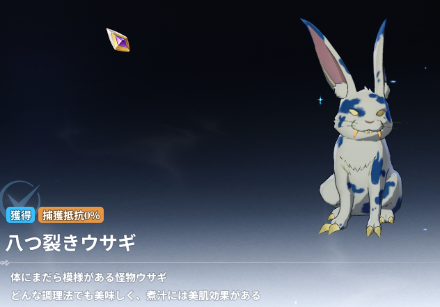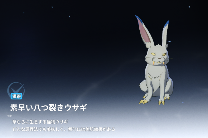 ちなみにウェアベアの野営地からビックモスの生息地手前らへんに「八つ裂きウサギ」の色違いの「素早い八つ裂きウサギ」がいます。こちらの「素早い八つ裂きウサギ」は捕獲できないので要注意です。