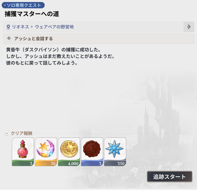 サブクエストは黄昏牛(ダスクバイソン)を捕獲後、アッシュに話しかけて終了。