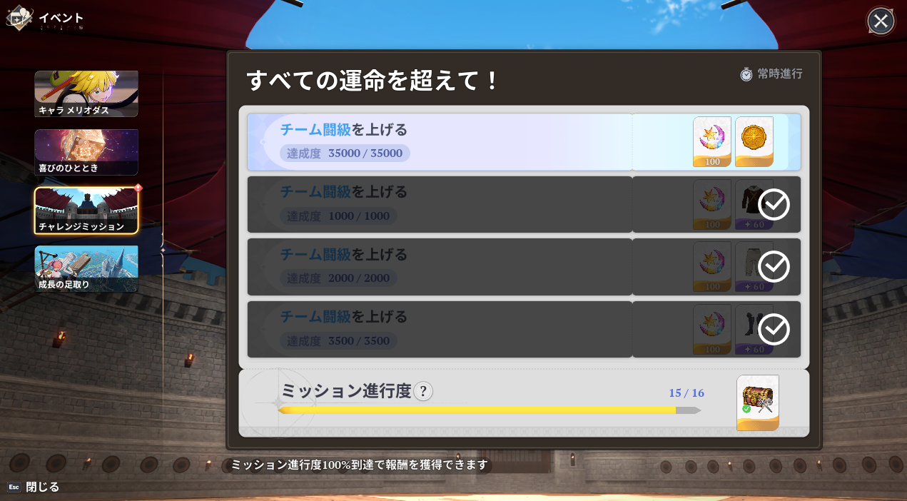 七つの大罪Origin(ナナオリ)のチーム闘級が35000になりました。これでイベントミッション「すべての運命を超えて!」は全て達成です。リリース直後からの手探り状態だったので、今思えばかなり効率が悪かった。