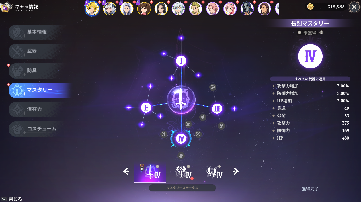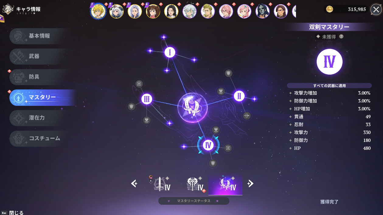 マスタリーⅠ~Ⅳの解放は「全ての武器に適用」となっているので使用していない武器以外も上げる必要があります。メリオダスは双剣→長剣と変えたので無駄に素材を使ってしまった。Ⅰ~Ⅳ以外の小さな星は使用している武器だけ上げましょう。