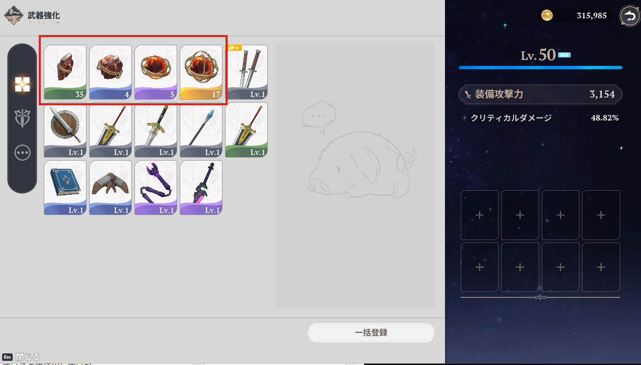 武器の強化でも闘級が上がりますが、大きな落とし穴があります。序盤はメリオダス120連を引くために多くのガチャを引くので多くの低レア武器を入手するはずです。僕はこれを全て武器強化に注ぎ込んでいた。