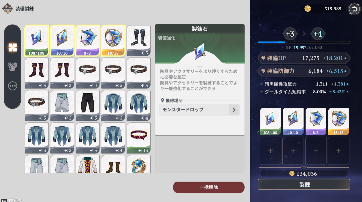 防具はSR以下は全て分解するか素材にする事になる。無駄に強化せず、強化アイテムを刻印装備まで温存しておきましょう。刻印装備でかなり闘級が伸びます。