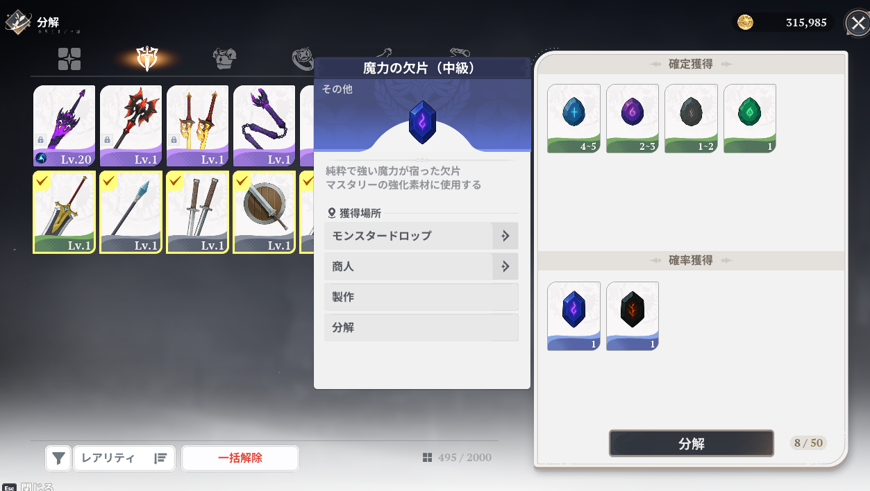 しかし低レア武器は作業台で分解してマスタリー素材にすべきです。これをしっかりとできれていればもっと早く闘級が上がったはずだ。ちなみにこの素材は武器作成などでも使用する。緩和されるようだが集めるのは凄く大変。