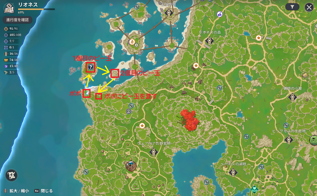 クエストの受注はウェアベアの野営地の北にいる「ポポ」から。ビー玉を2つ探すクエストです。