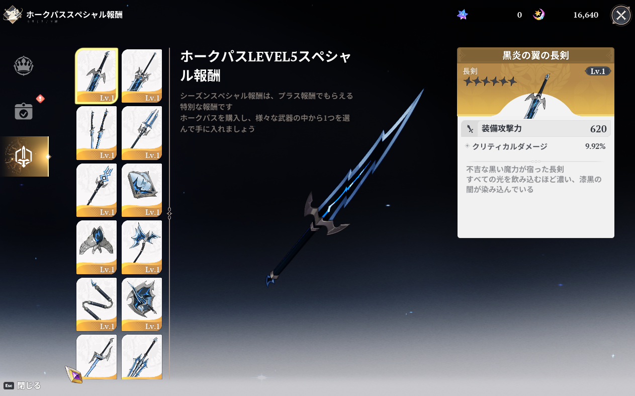 「ホークパスプラス(1250円)」「ホークパスプレミアム(2500)」のホークパスLEVEL5スペシャル報酬として入手できる武器は「黒炎の翼」シリーズで好きな武器を選択して獲得できます。