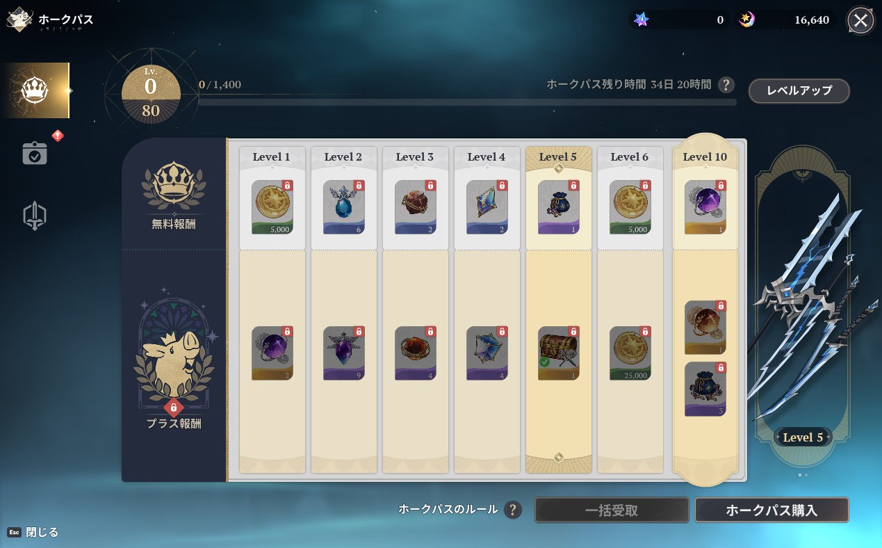 | 武器強化Lv.5に到達:1回 | ホークパスEXP×600 |