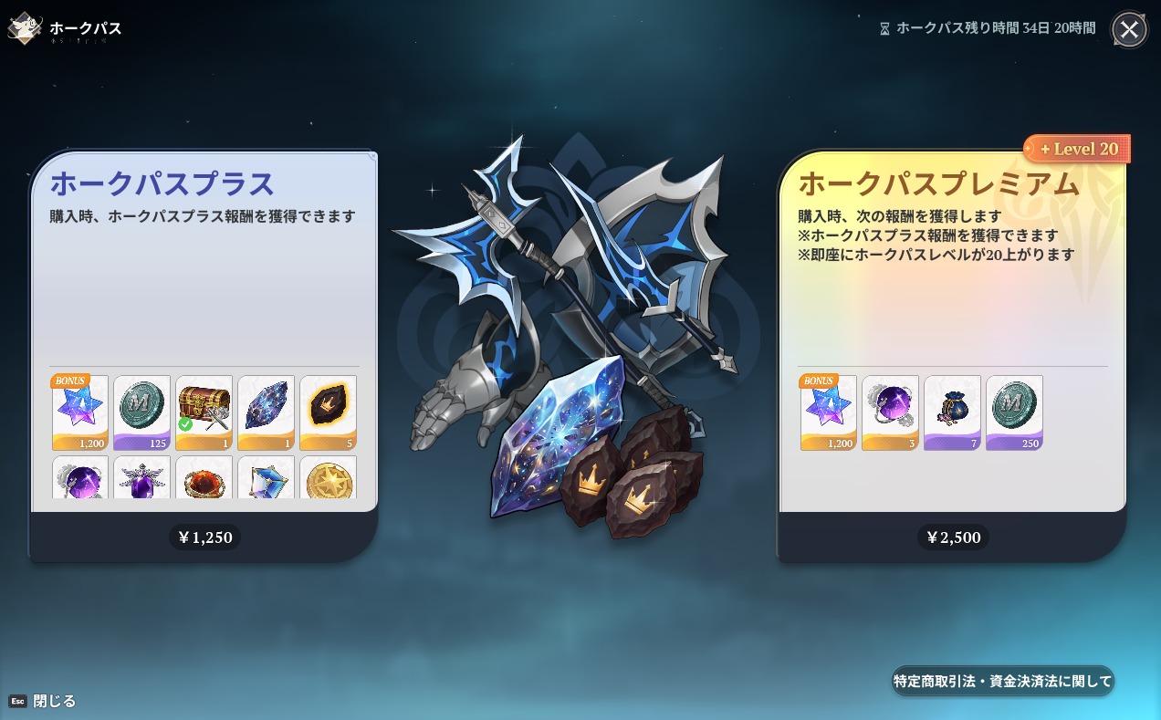 ホークパスには課金要素「ホークパスプラス(1250円)」と「ホークパスプレミアム(2500)」があります。「ホークパスプレミアム(2500)」は購入時即座にホークパスレベルが20に上がります。