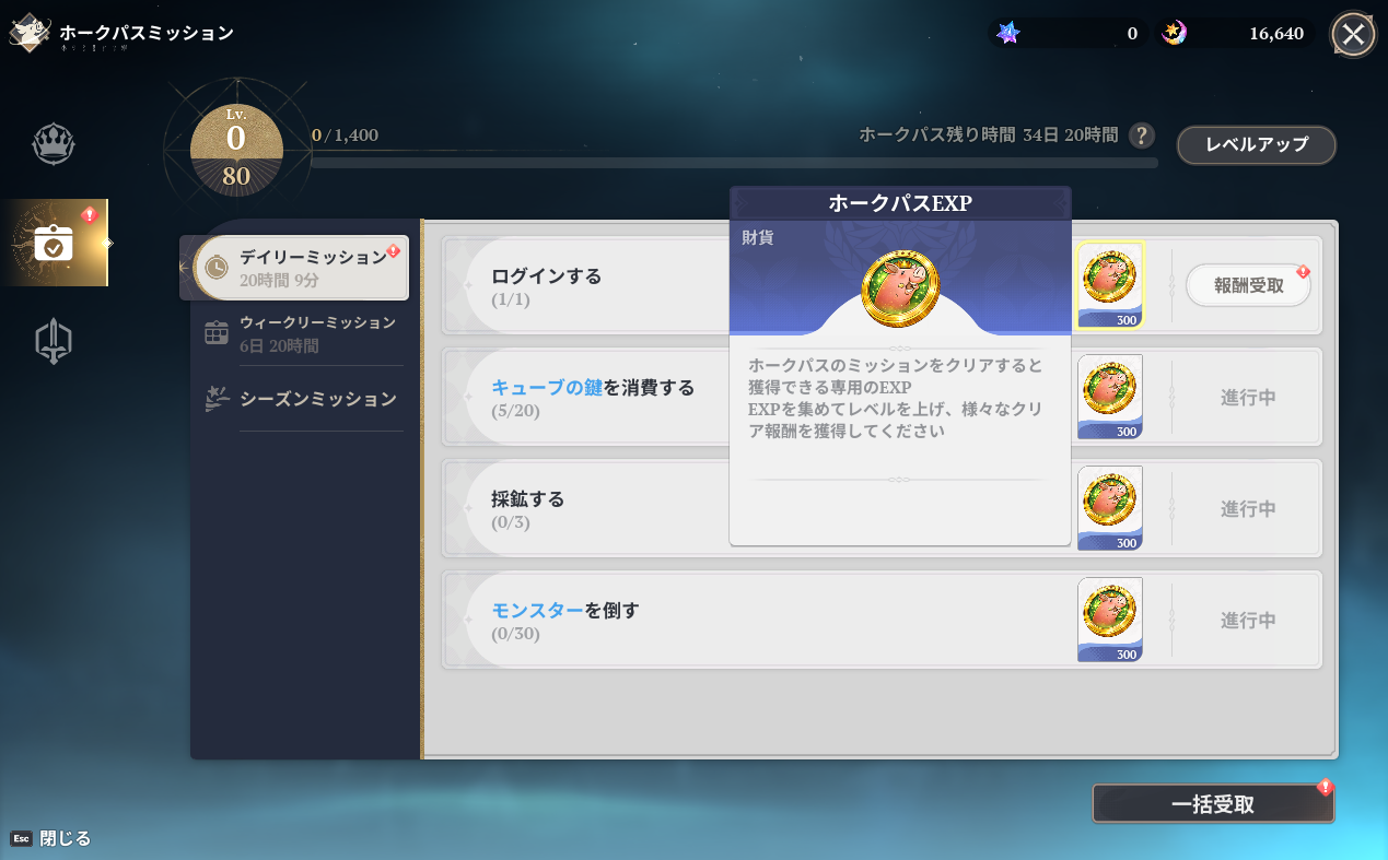 | ダンジョンのボスモンスターを倒す(マスタリー強化/ゴールドダンジョンを除く):10回 | ホークパスEXP×900 |
