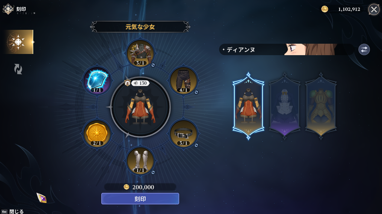 やったぜ…蘇った悪魔のブーツでどハマリしていたがやった刻印装備を作る事ができるんだ。作成したのはディアンヌのSSR刻印装備の元気な少女。