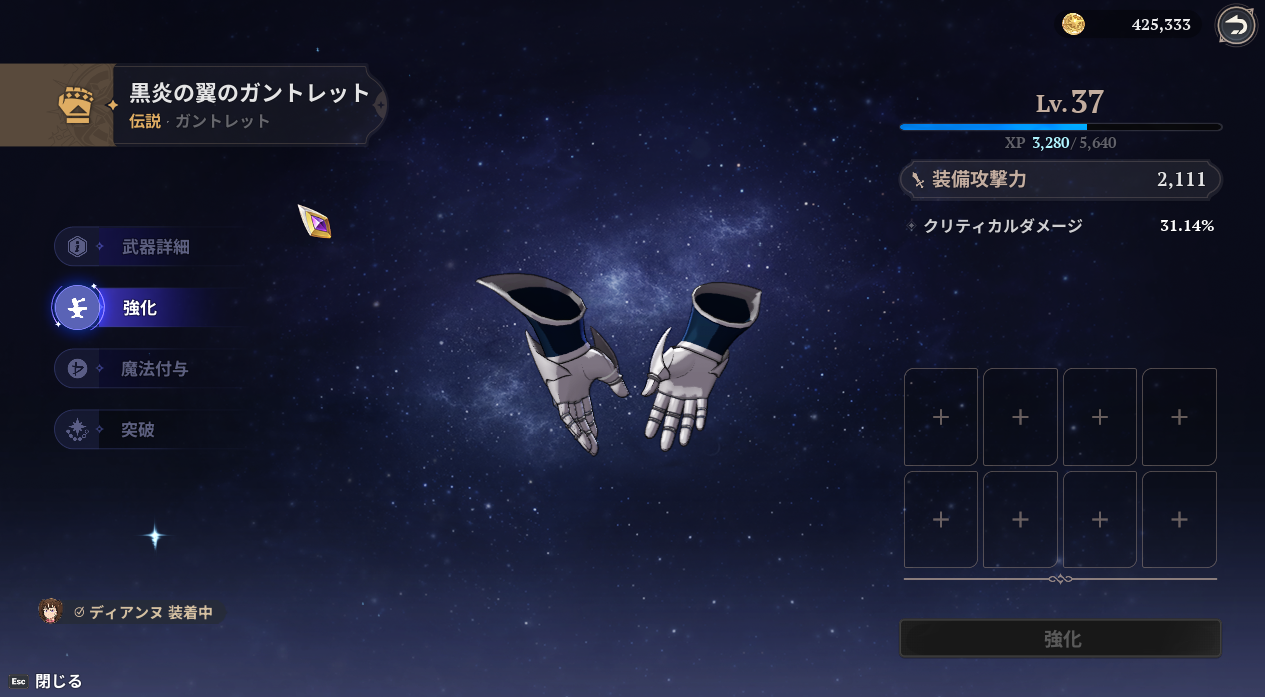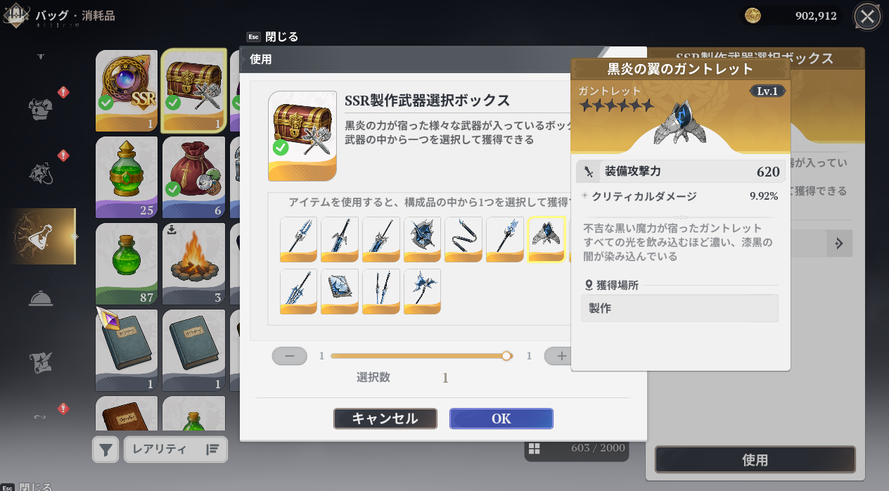 黒炎の翼のガントレットを装備。よしカッコいい。三節棍はしばらくはSRでいいやぁ。