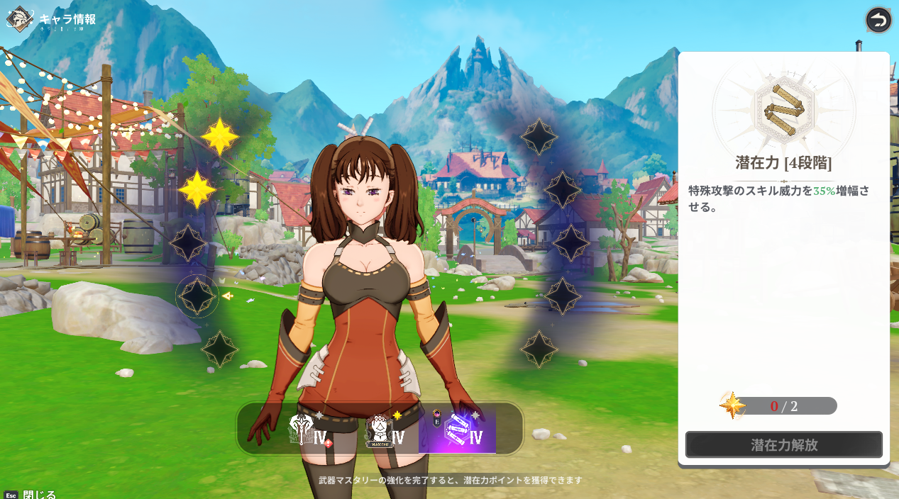 七つの大罪Origin(ナナオリ)ではキャラクターの無凸、母体のみでも潜在力4段階まで強化する事が可能です。潜在力ポイントを入手できるのはマスタリー強化で、全て埋める事で潜在力ポイントを獲得できます。