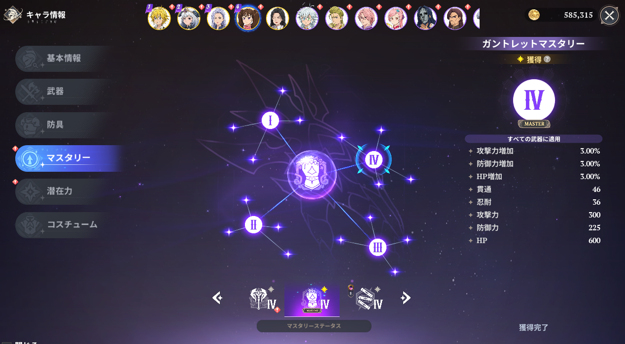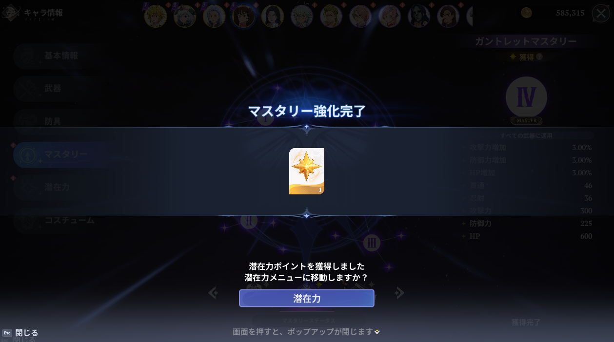 武器マスタリーは各キャラ3種類あるので全部で3個の潜在力ポイントが入手できる事になる。