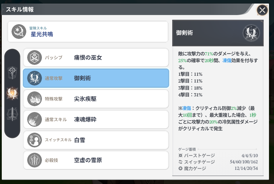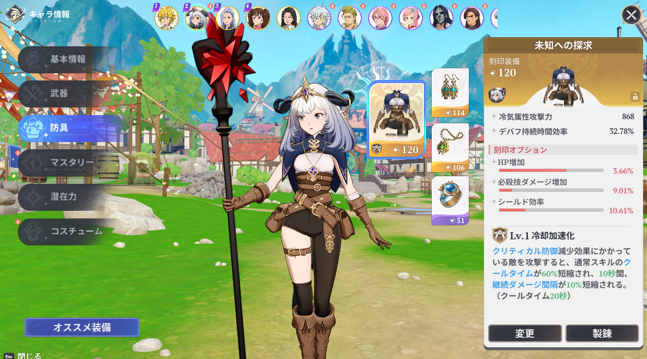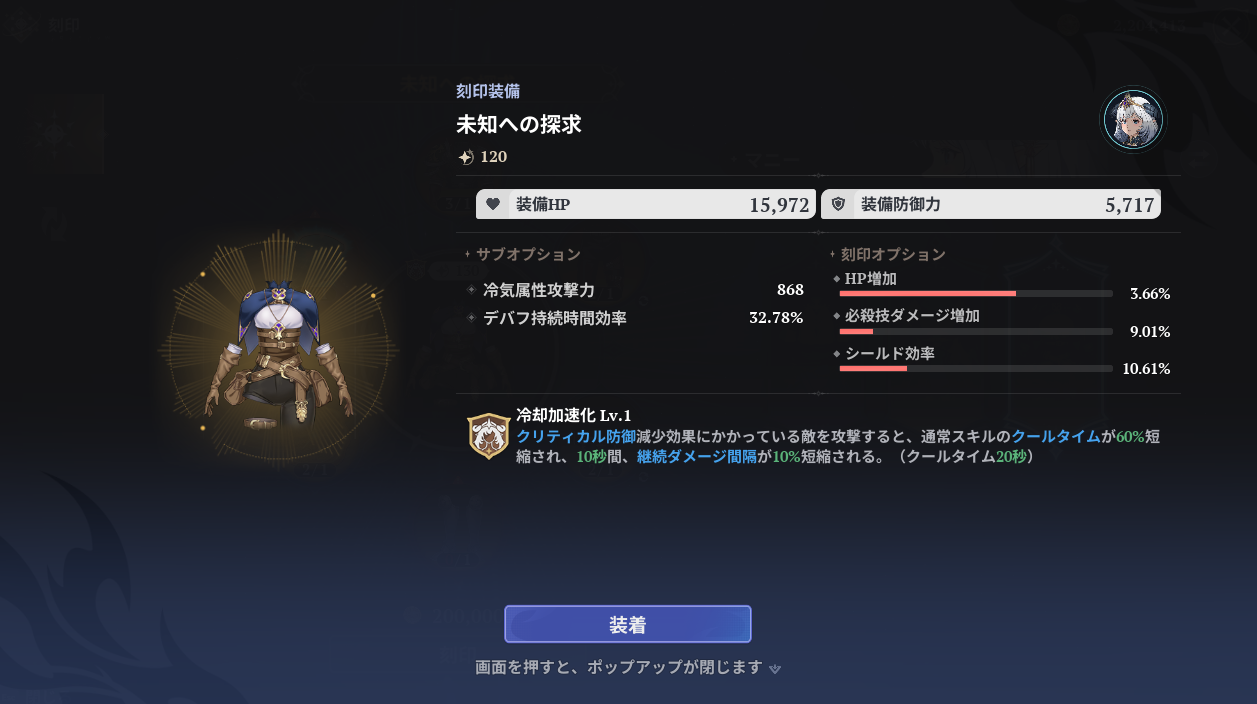 未知への探求の主な効果は冷気属性攻撃力とデバフ時間のアップ。クリティカル防御ダウン中の敵を攻撃すると通常スキルのクールタイム短縮に継続ダメージの強化。