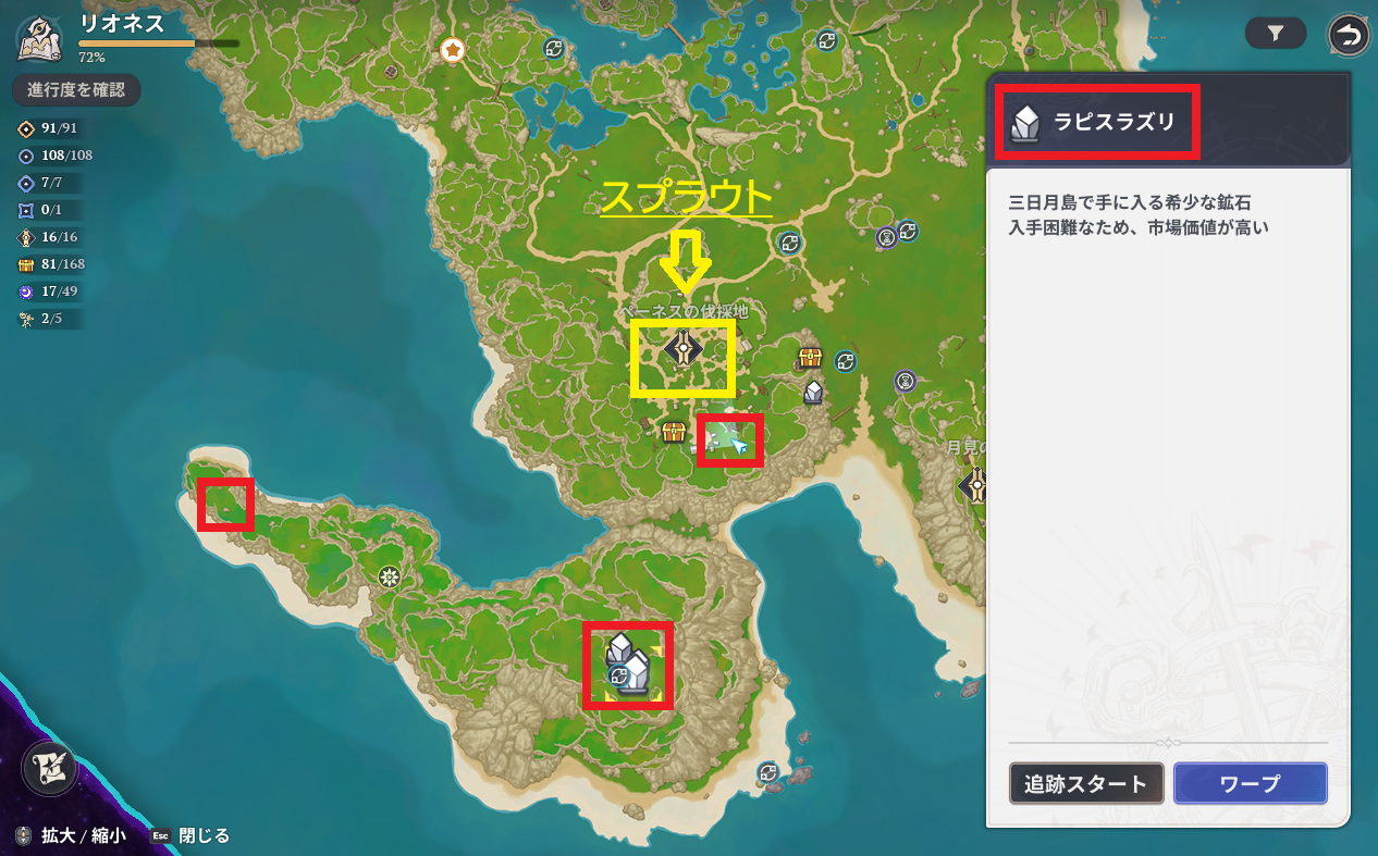 スプラウトの捕獲場所はワープポイント「ペーネスの伐採地」の周辺。スプラウトがうじゃうじゃいます。赤い四角はラピスラズリが採鉱できる場所、この3か所以外は現状で入手できません。