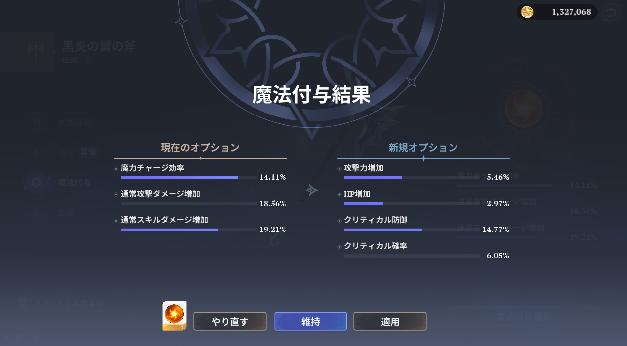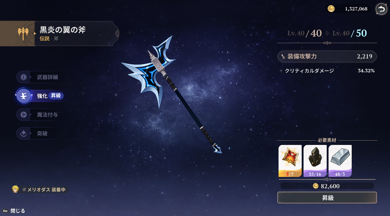 レベル1のSR斧をSSRの黒炎の翼の斧Lv40(攻撃力2219)に変更してみます。