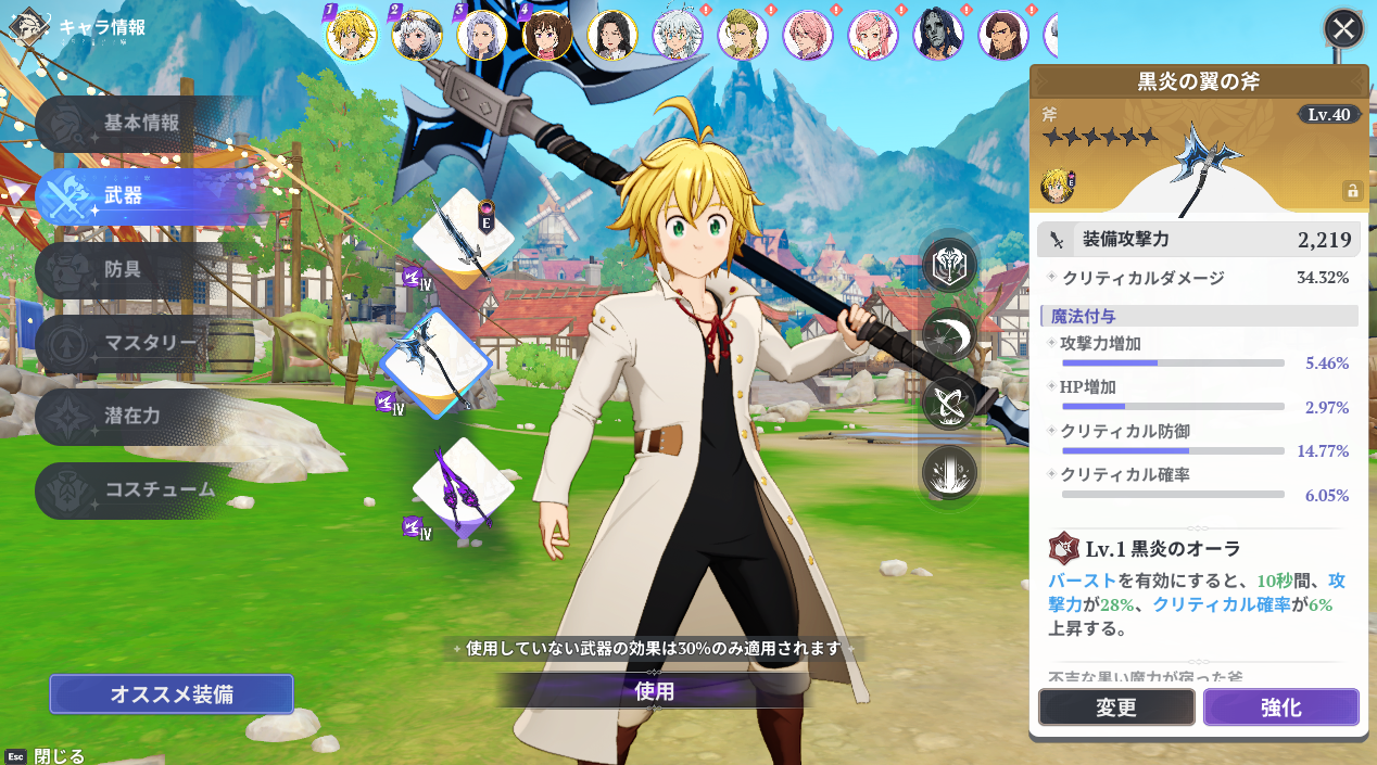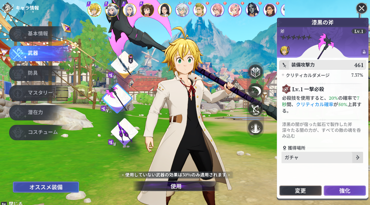 七つの大罪Origin(ナナオリ)では1キャラクターで3種の武器を装備する事ができます。戦闘中に武器の切り替えなどはないので使用するのは1種の武器だけとなるが、他2つの武器が意味がないわけではない。